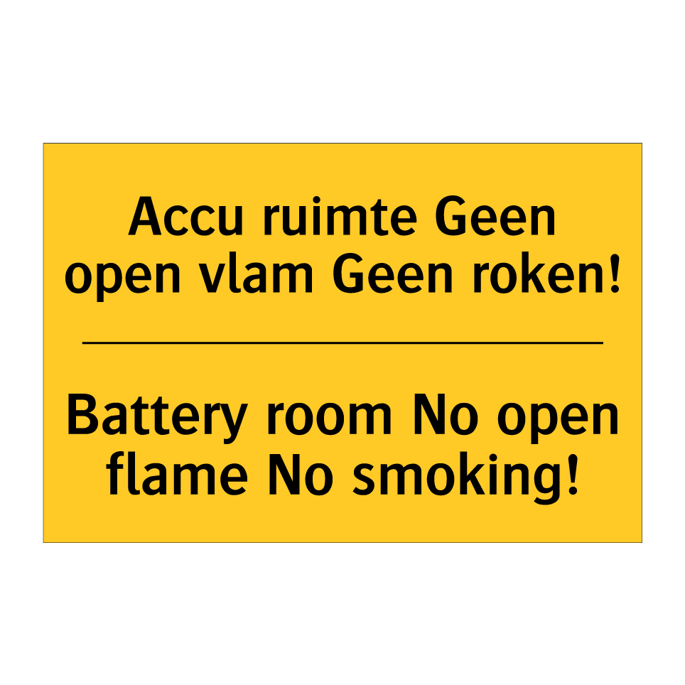 Waarschuwingsbord met de tekst Accu ruimte Geen open vlam Geen roken! / Battery room No open flame No smoking!