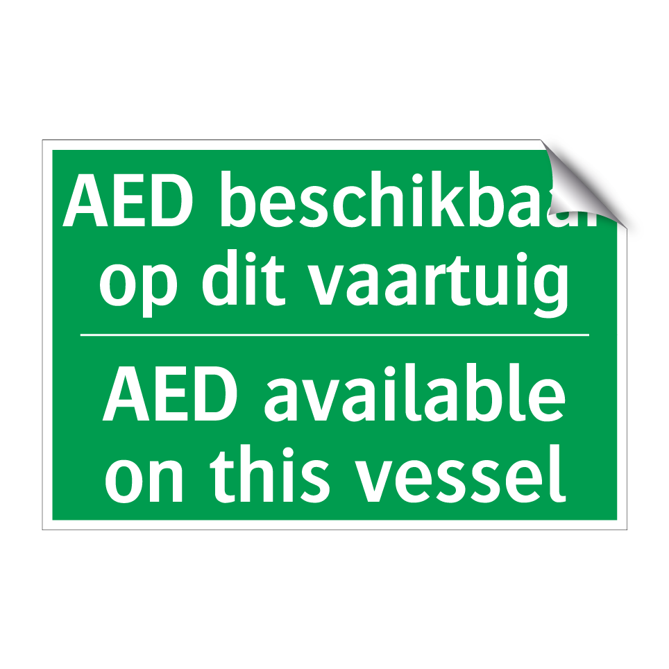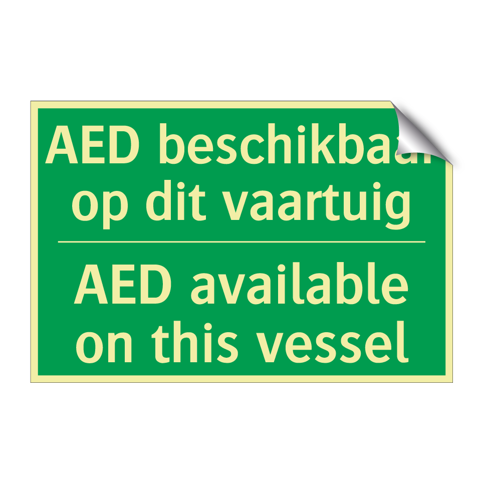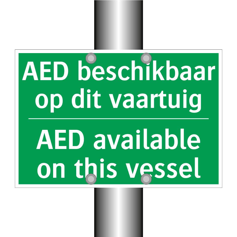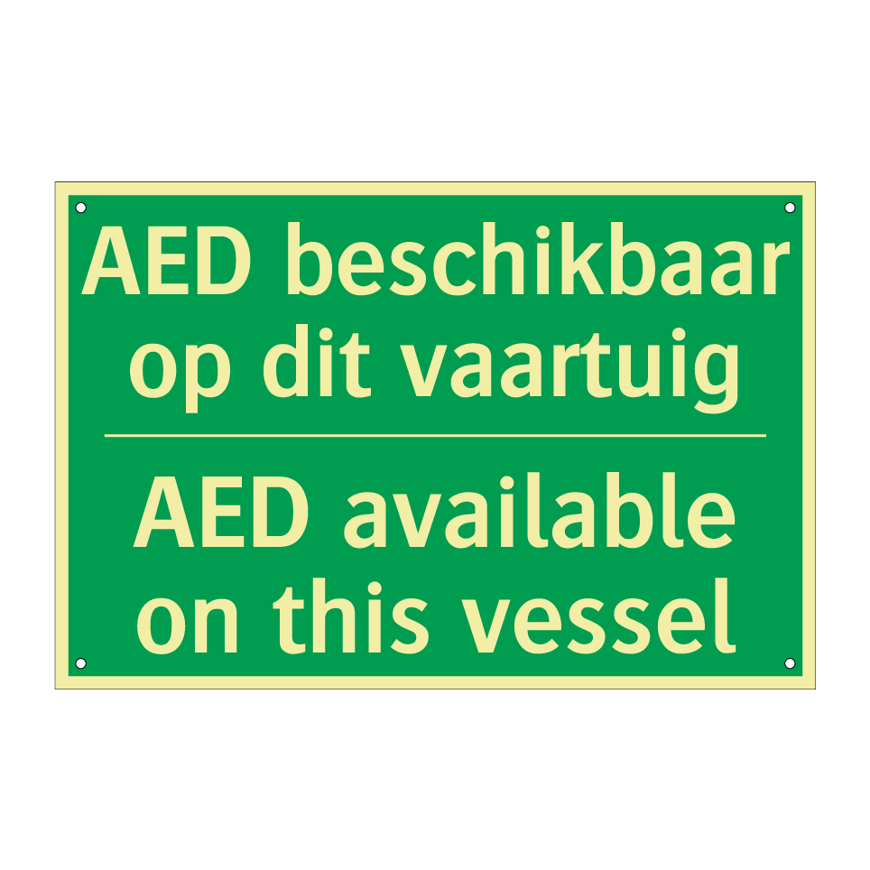 Noodbord met tekst AED beschikbaar op dit vaartuig / AED available on this vessel