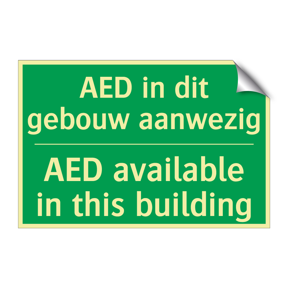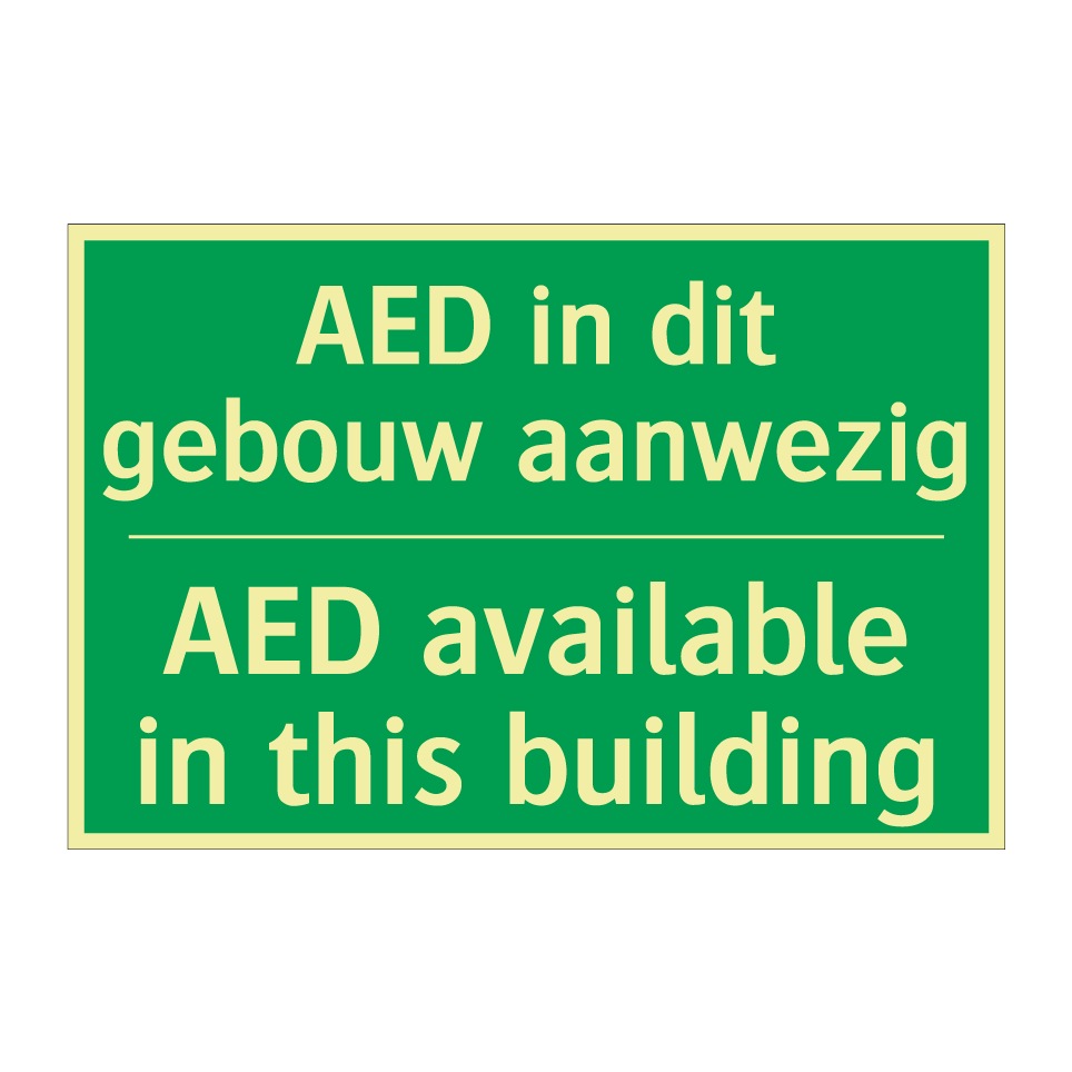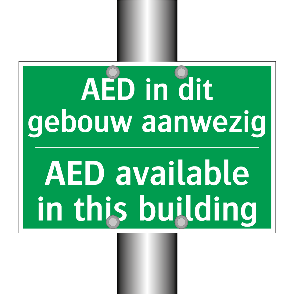 Noodbord met tekst AED in dit gebouw aanwezig / AED available in this building