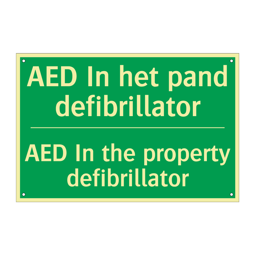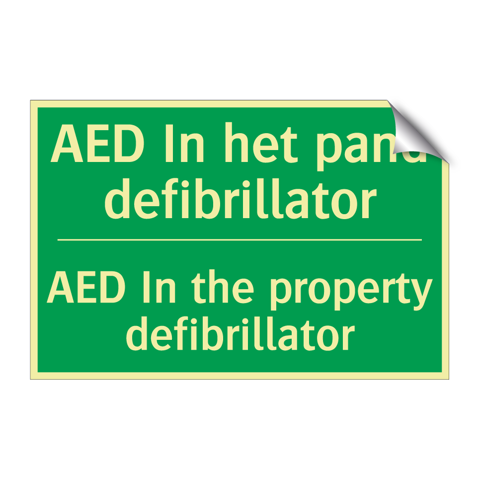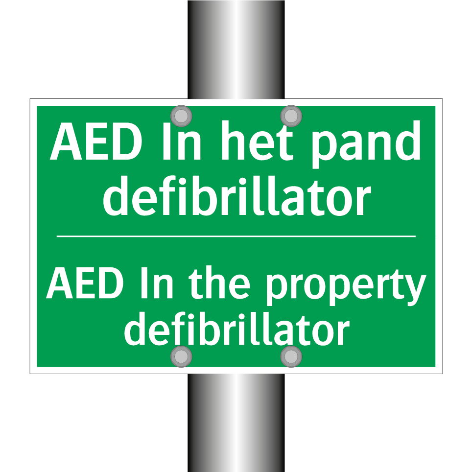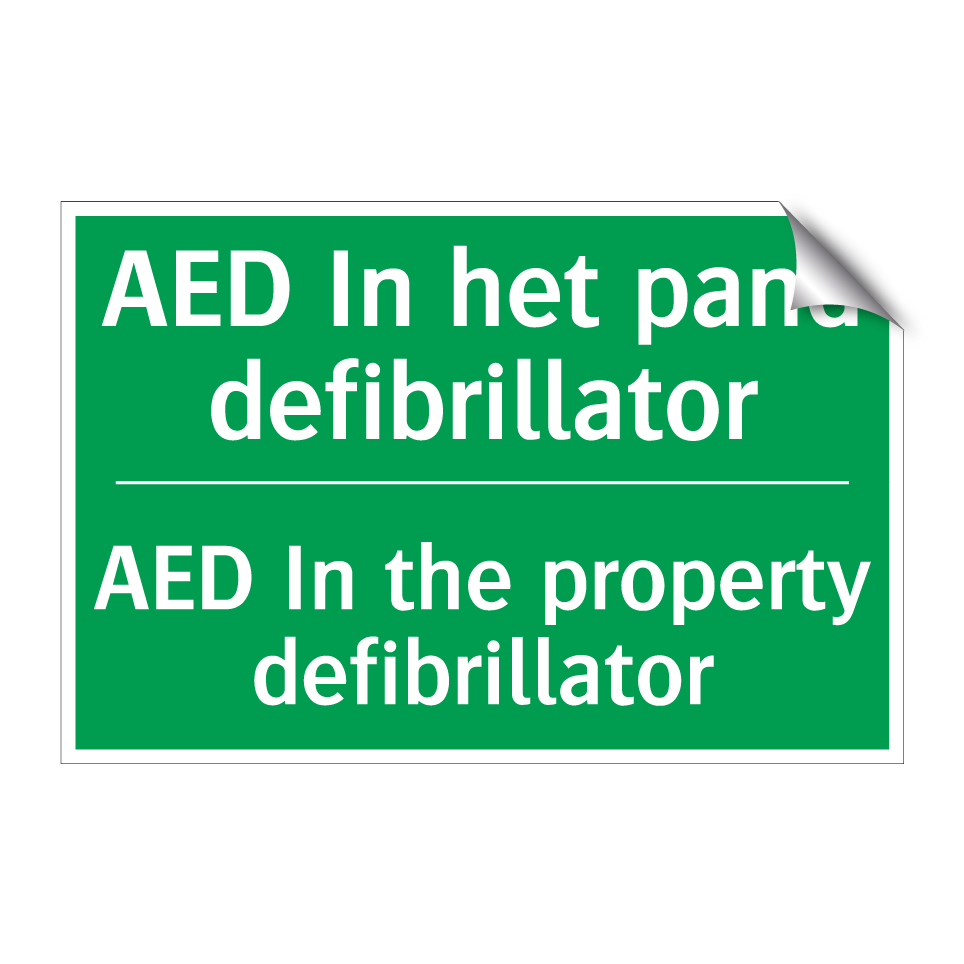 Noodbord met tekst AED In het pand defibrillator / AED In the property defibrillator