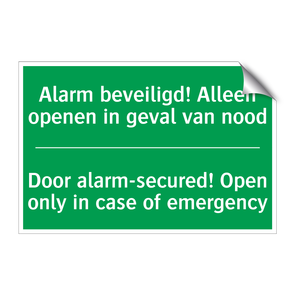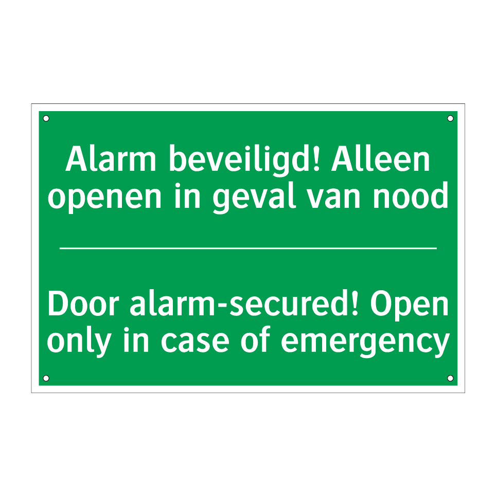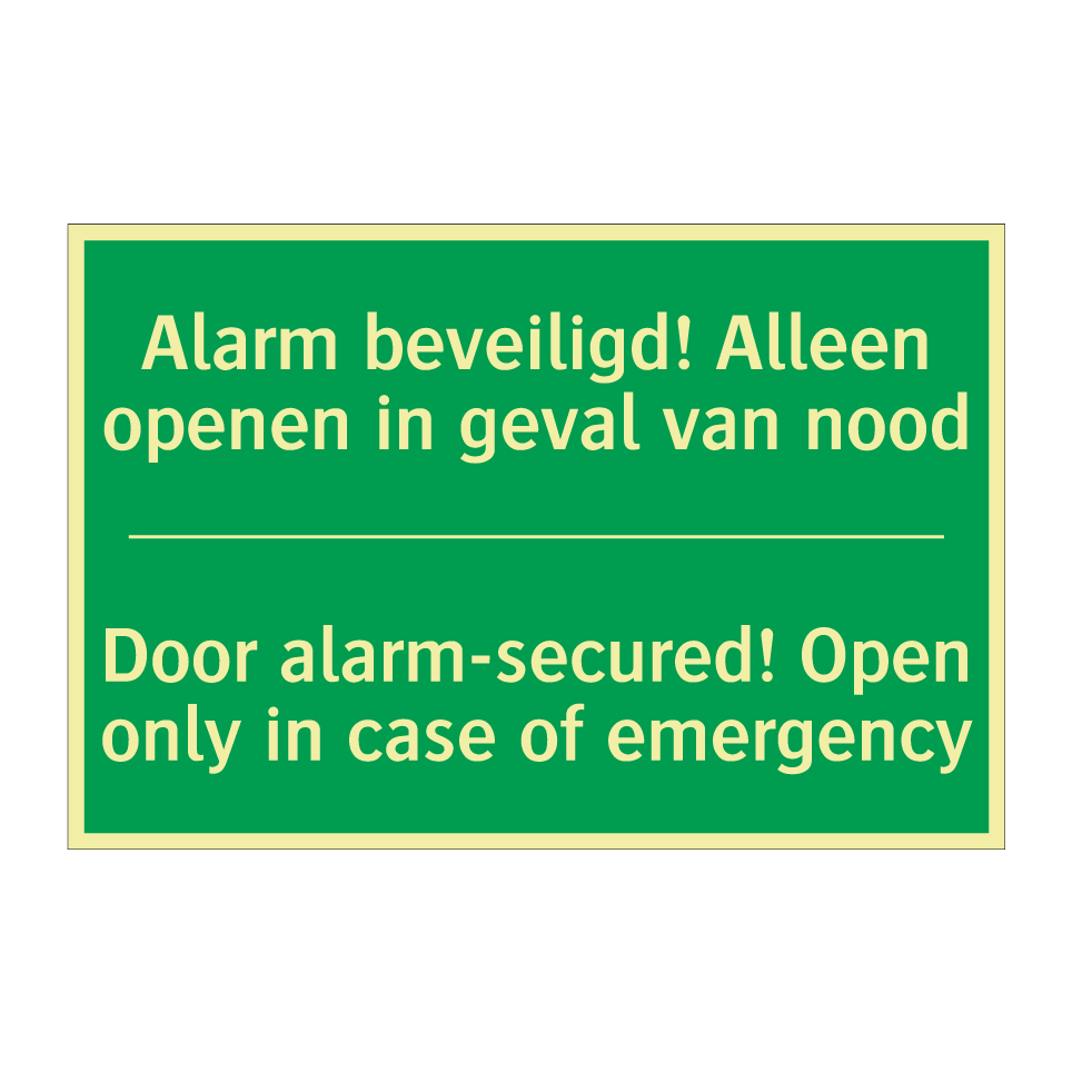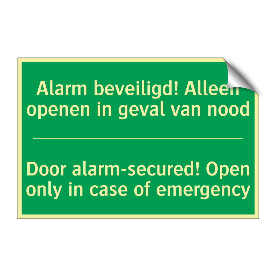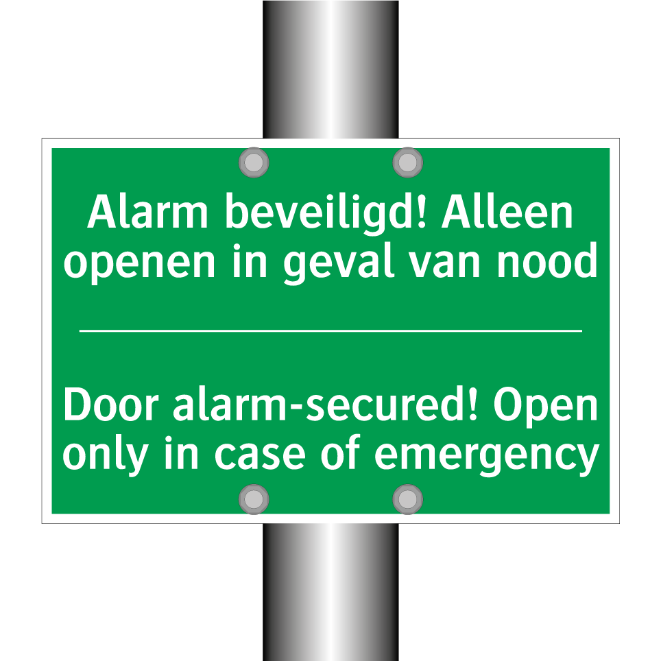 Noodbord met tekst Alarm beveiligd! Alleen openen in geval van nood / Door alarm-secured! Open only in case of emergency.