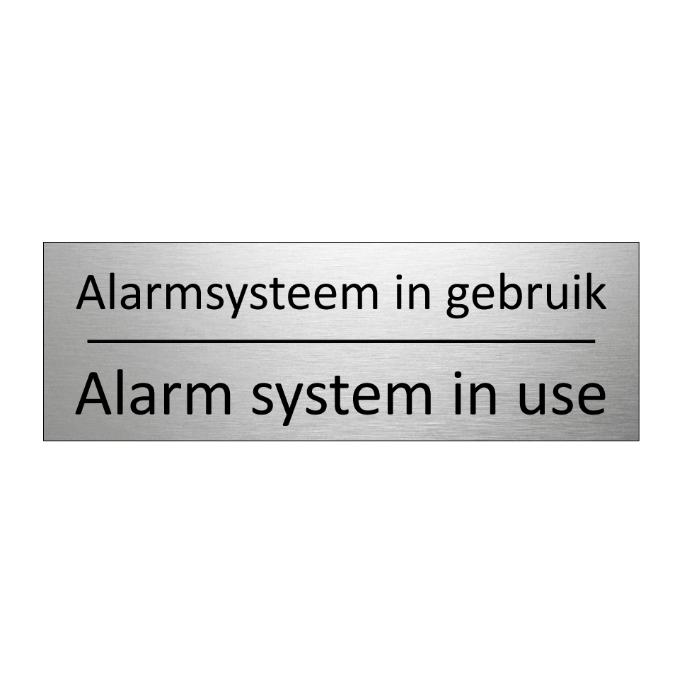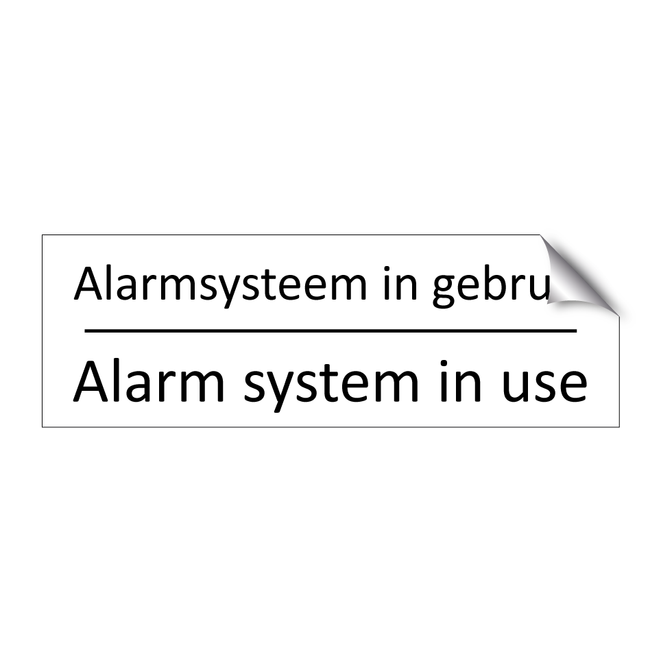 Informatiebord met tekst in het nederlands en engels. Dit bord luidt: Alarmsysteem in gebruik evenals met de engelse vertaling Alarm system in use.