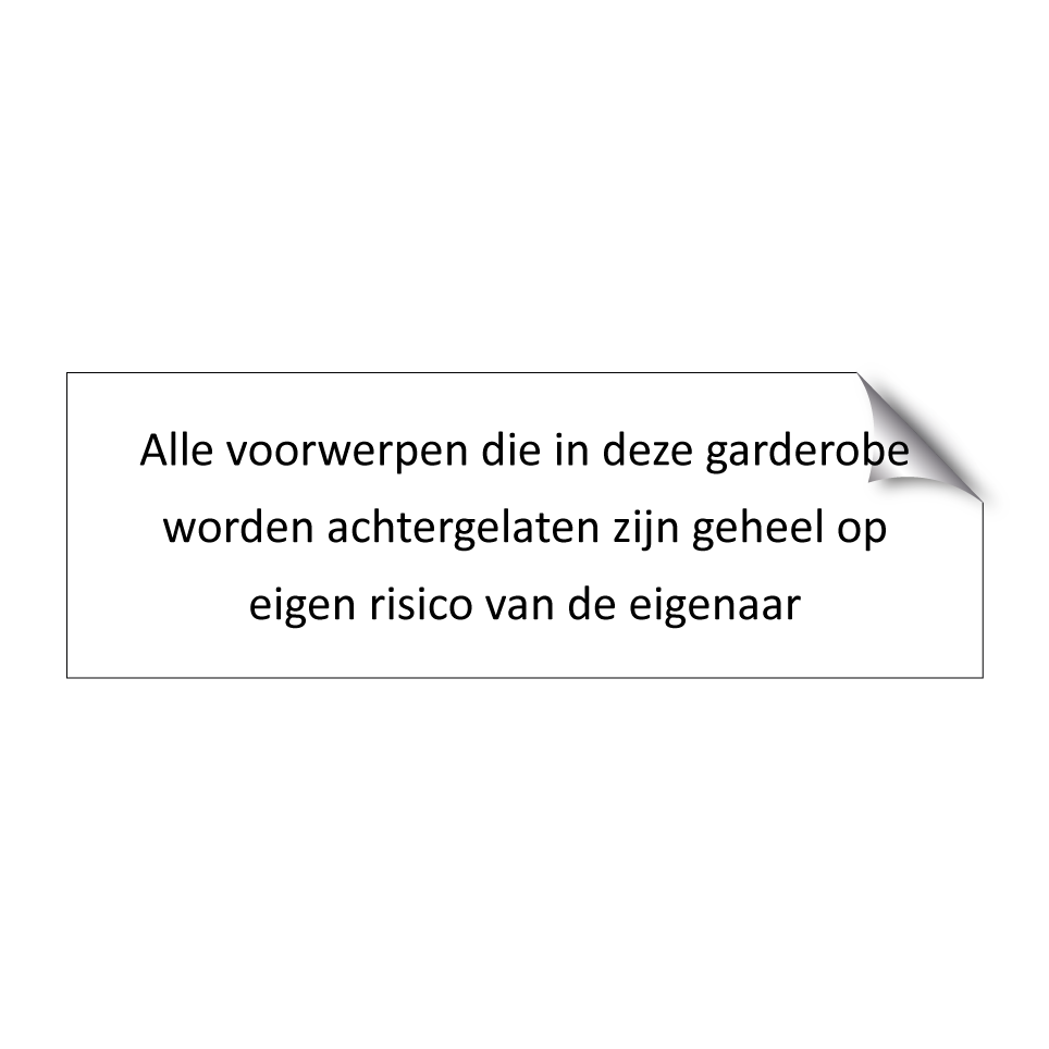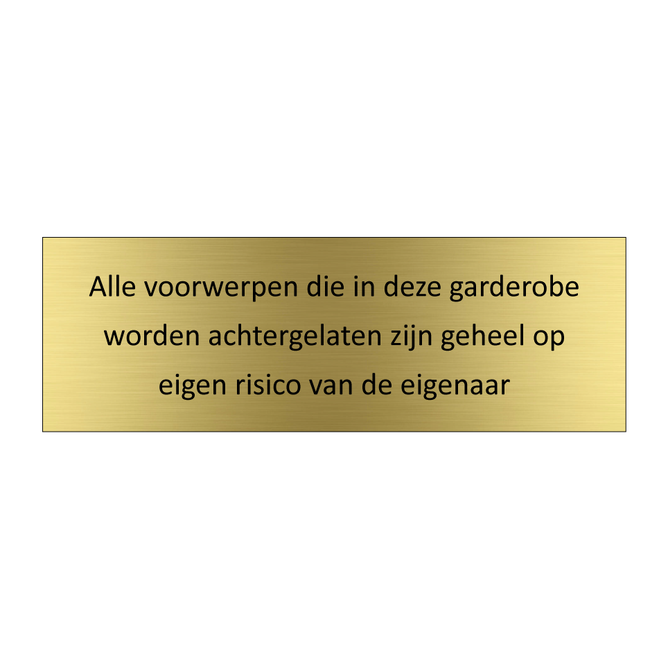 Informatiebord met tekst Alle voorwerpen die in deze garderobe worden achtergelaten zijn geheel op eigen risico van de eigenaar.