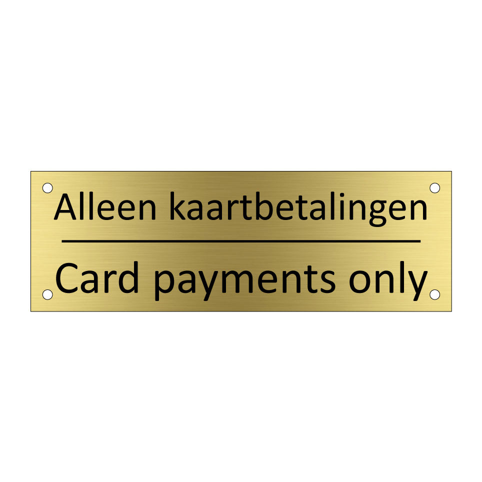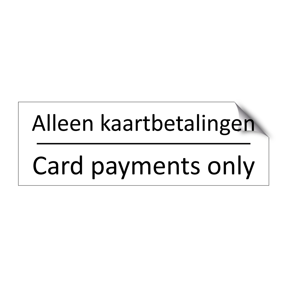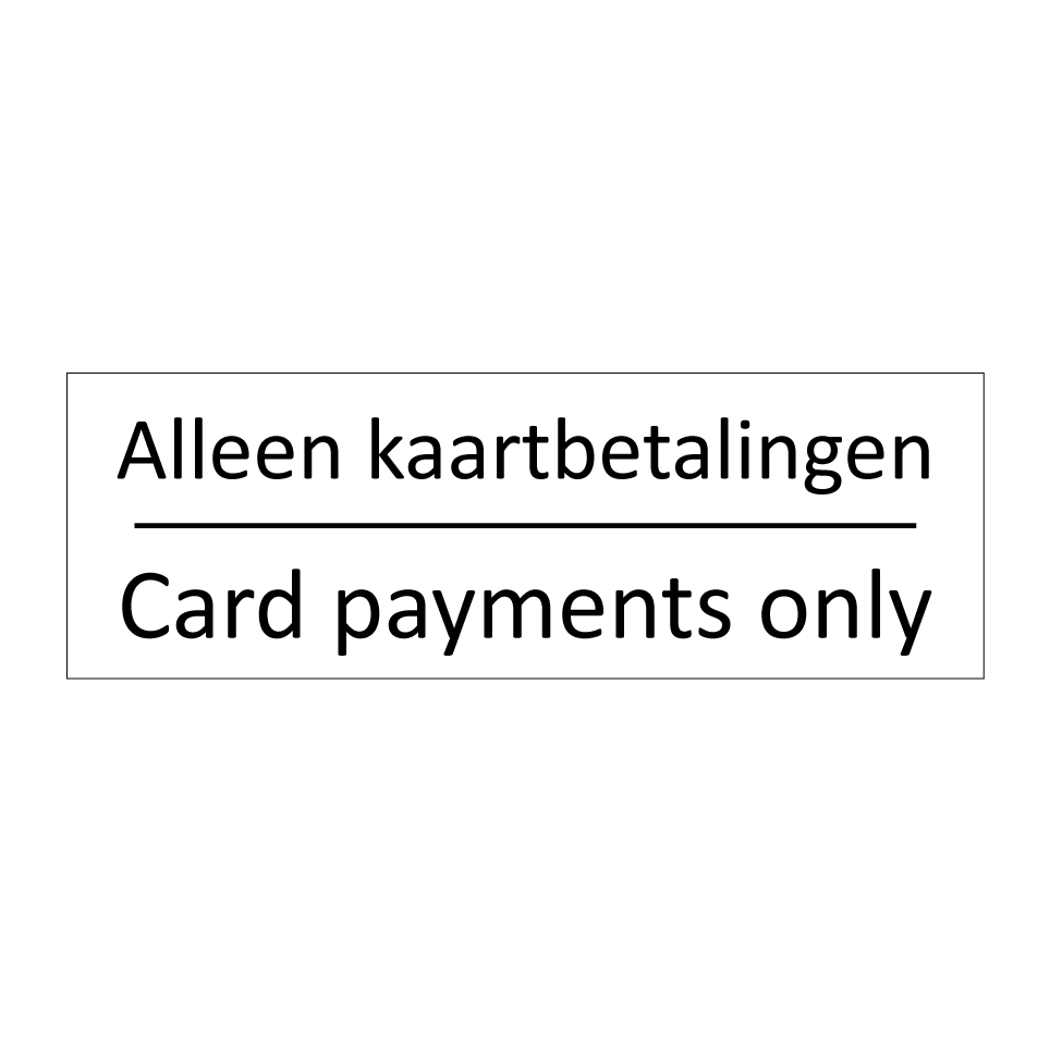 Informatiebord met tekst in het nederlands en engels. Dit bord luidt: Alleen kaartbetalingen evenals met de engelse vertaling Card payments only.