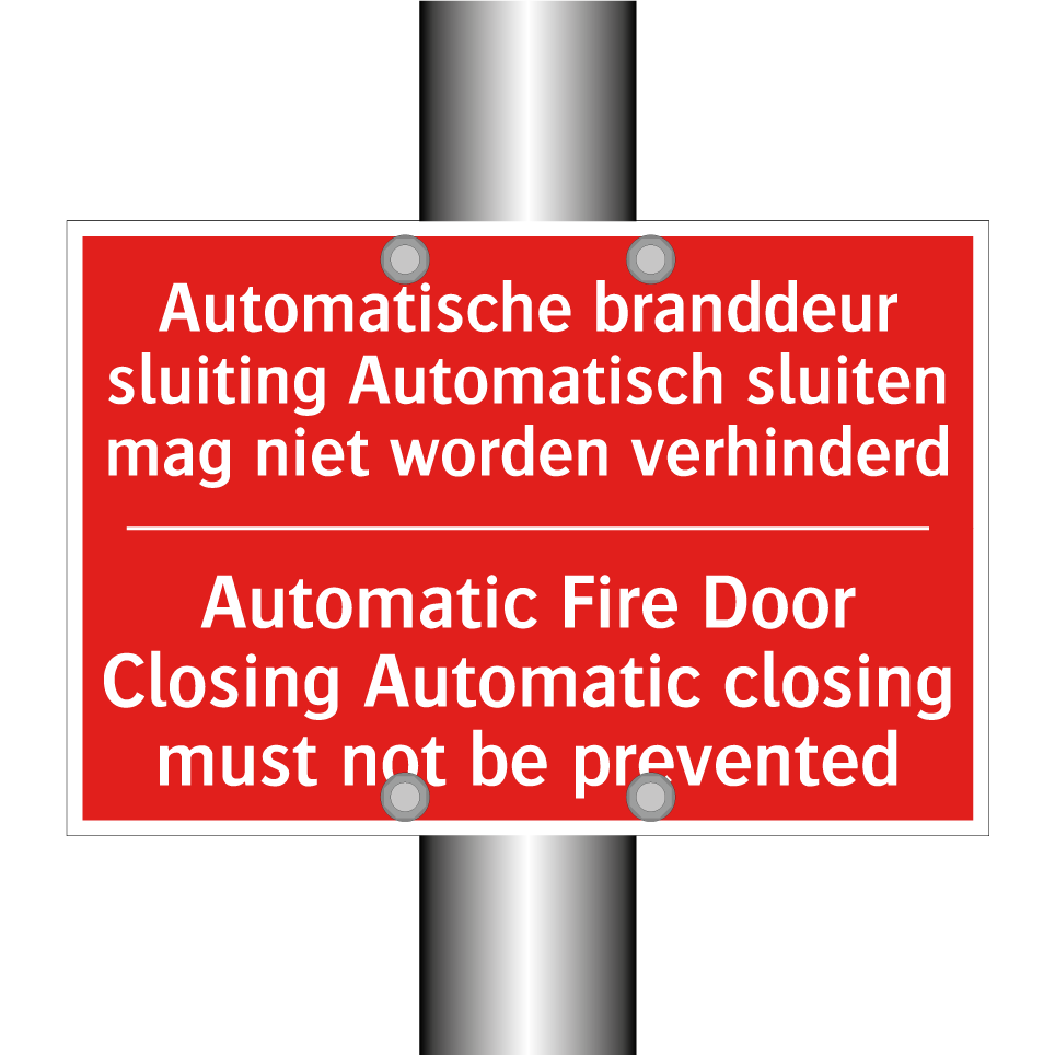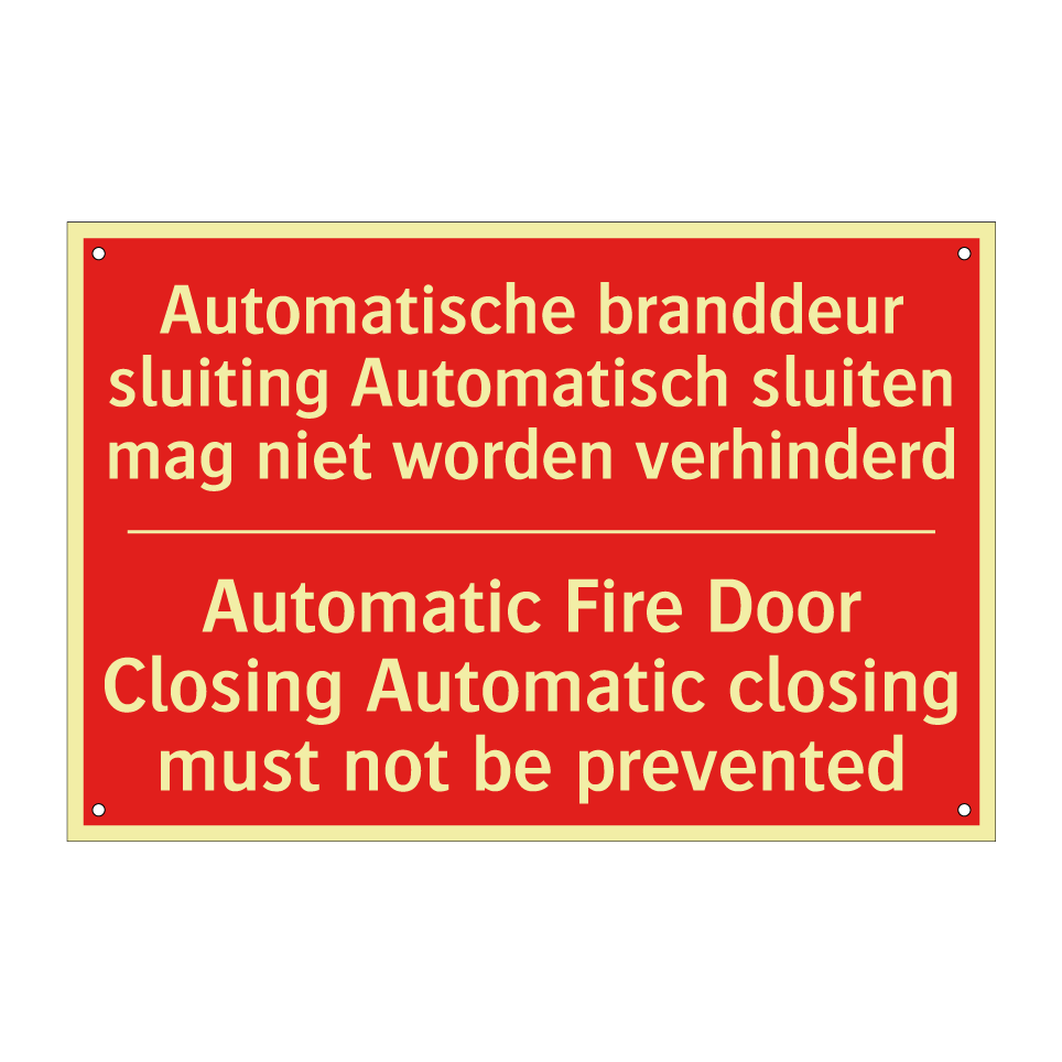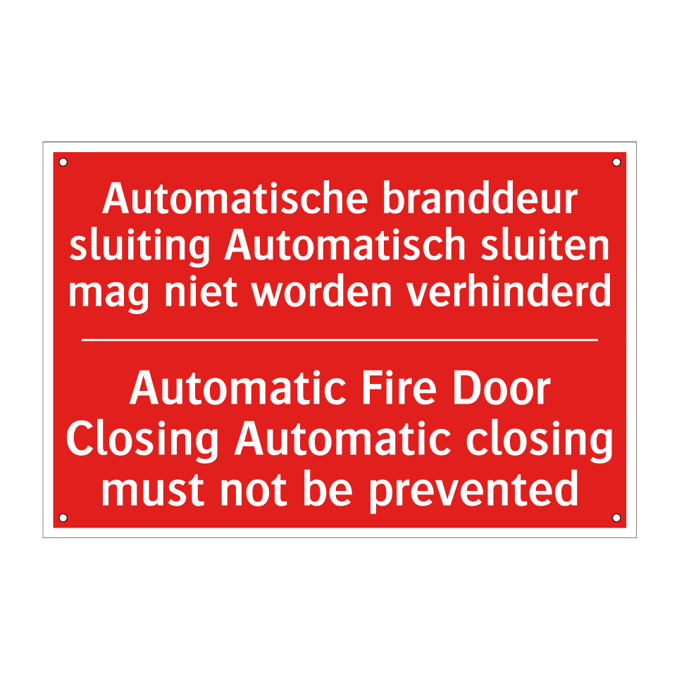 Brandbord met tekst Automatische branddeur sluiting Automatisch sluiten mag niet worden verhinderd / Automatic Fire Door Closing Automatic closing must not be prevented