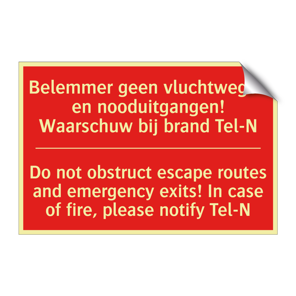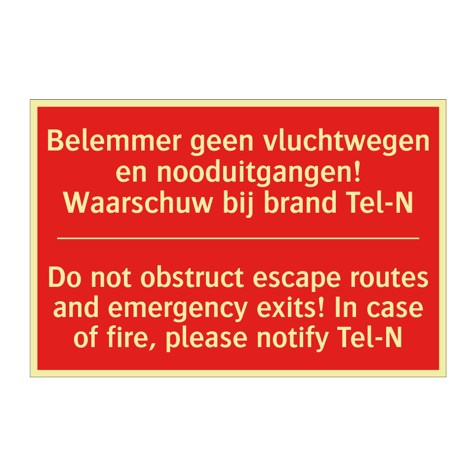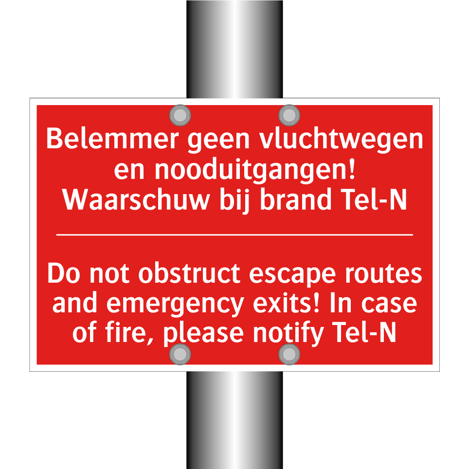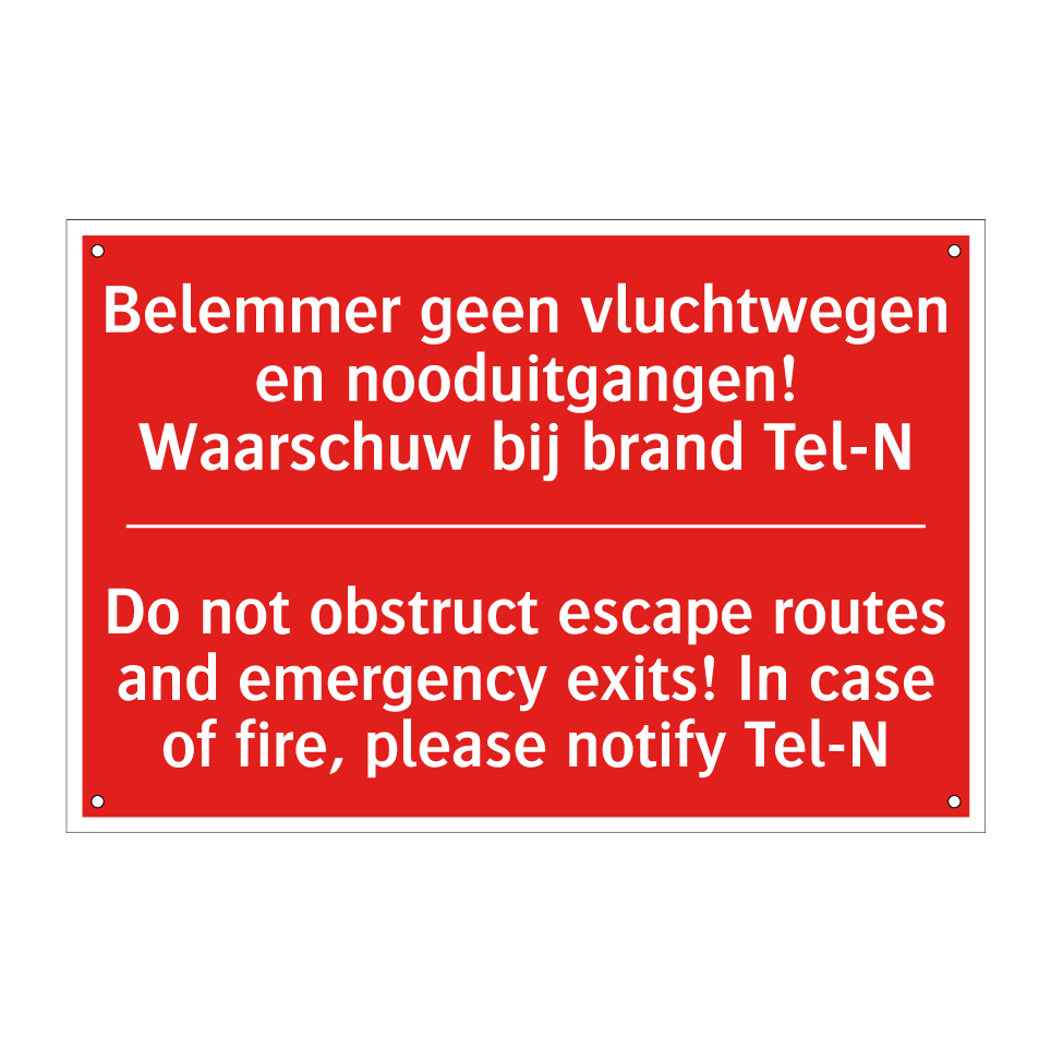 Brandbord met tekst Belemmer geen vluchtwegen en nooduitgangen! Waarschuw bij brand Tel-N - Do not obstruct escape routes and emergency exits! In case of fire, please notify Tel-N