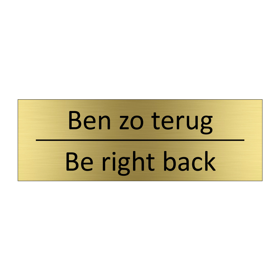 Informatiebord met tekst in het nederlands en engels. Dit bord luidt: Ben zo terug evenals met de engelse vertaling Be right back.