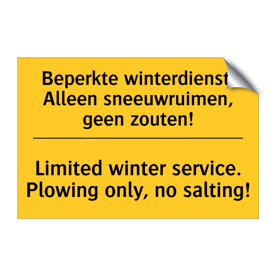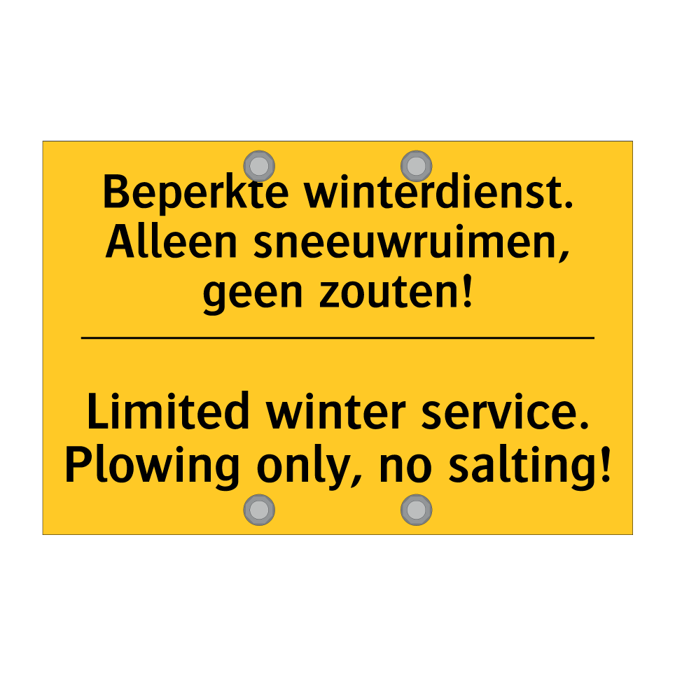 Waarschuwingsbord met de tekst Beperkte winterdienst. Alleen sneeuwruimen, geen zouten! / Limited winter service. Plowing only, no salting!