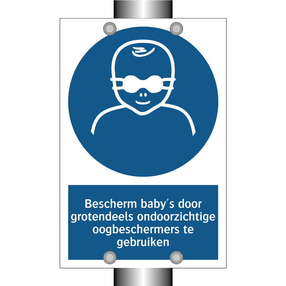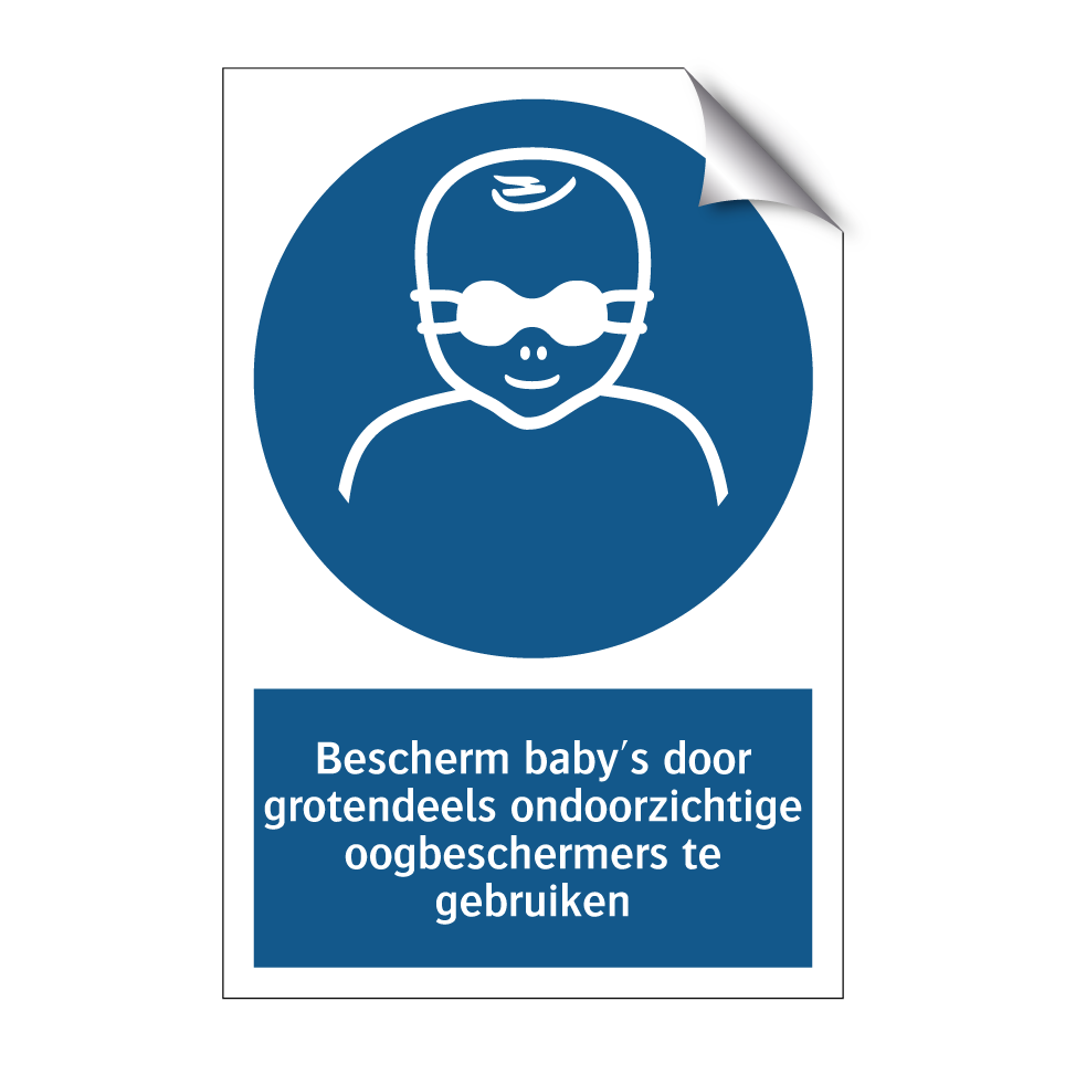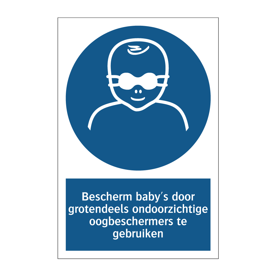 Verplichte bord met de tekst Bescherm baby's door grotendeels ondoorzichtige oogbeschermers te gebruiken