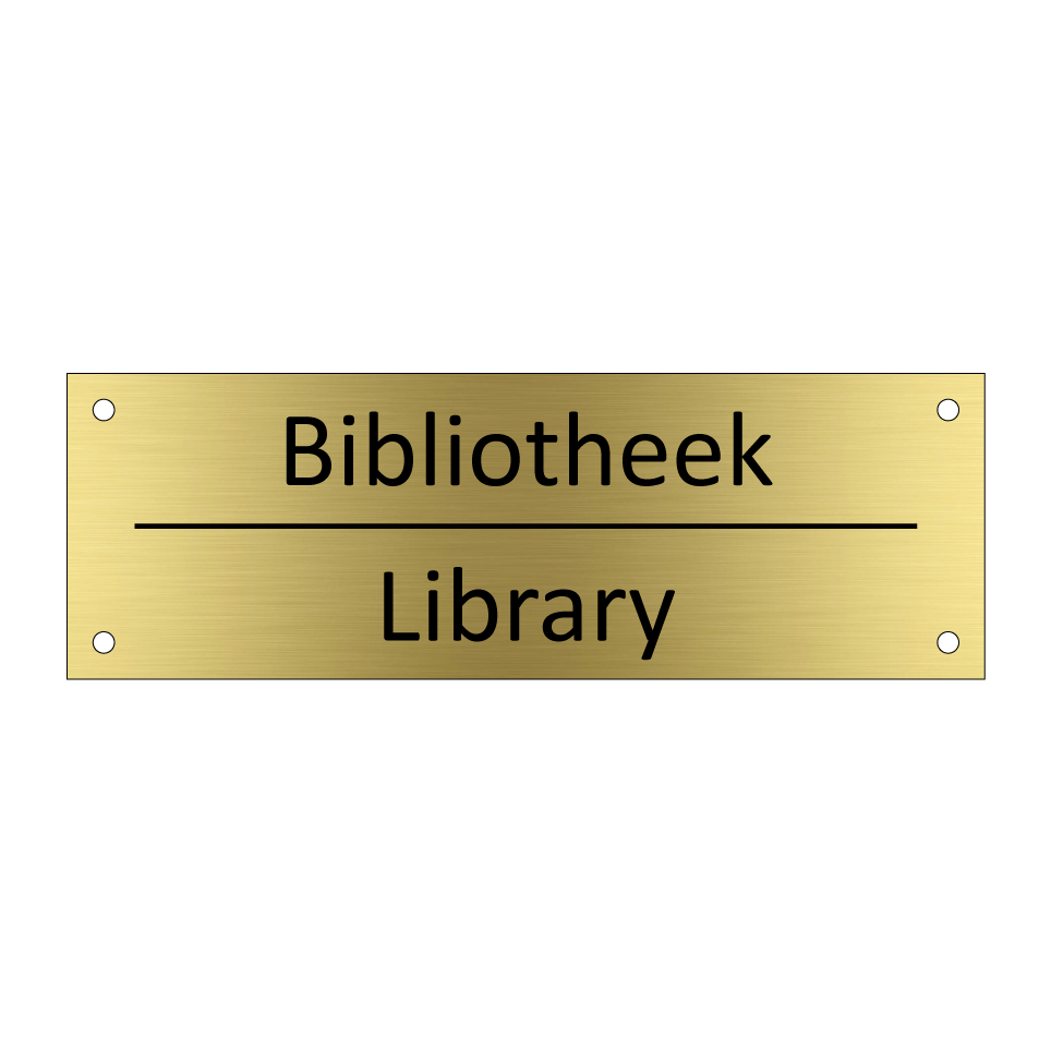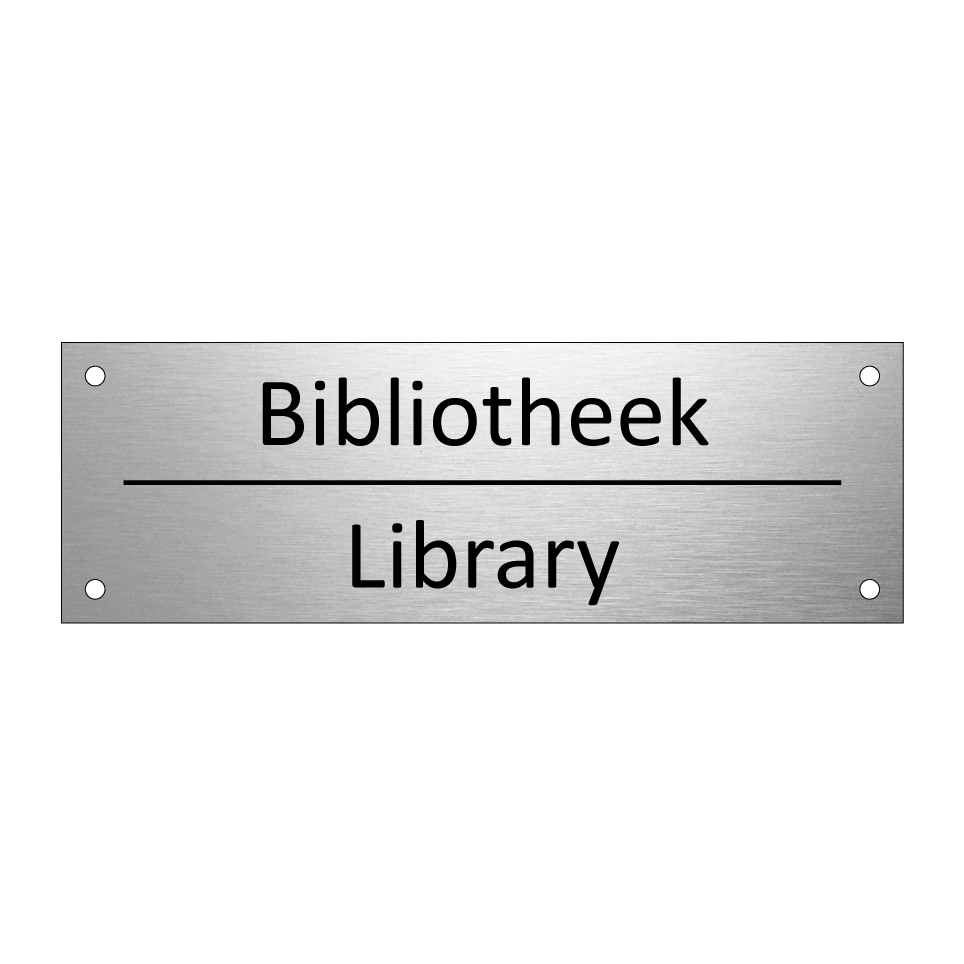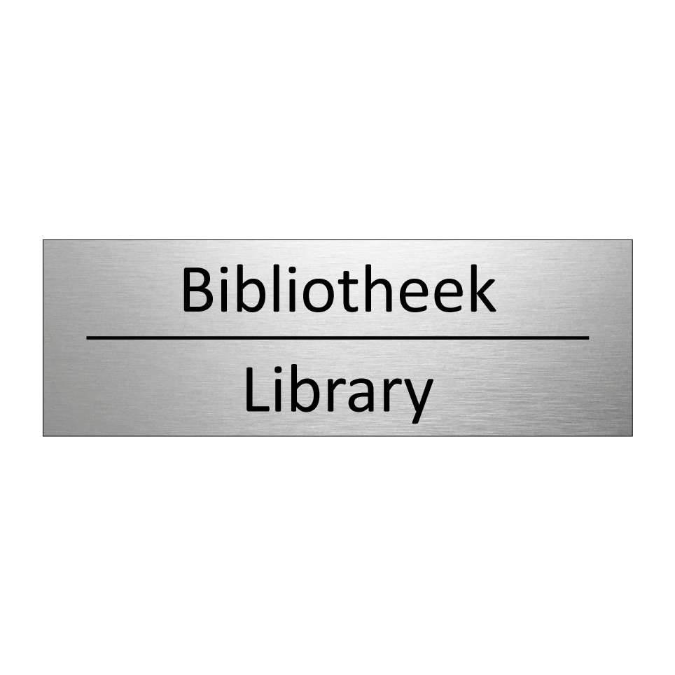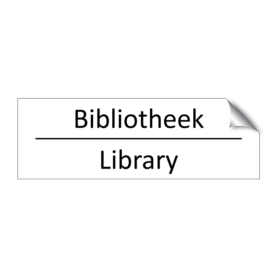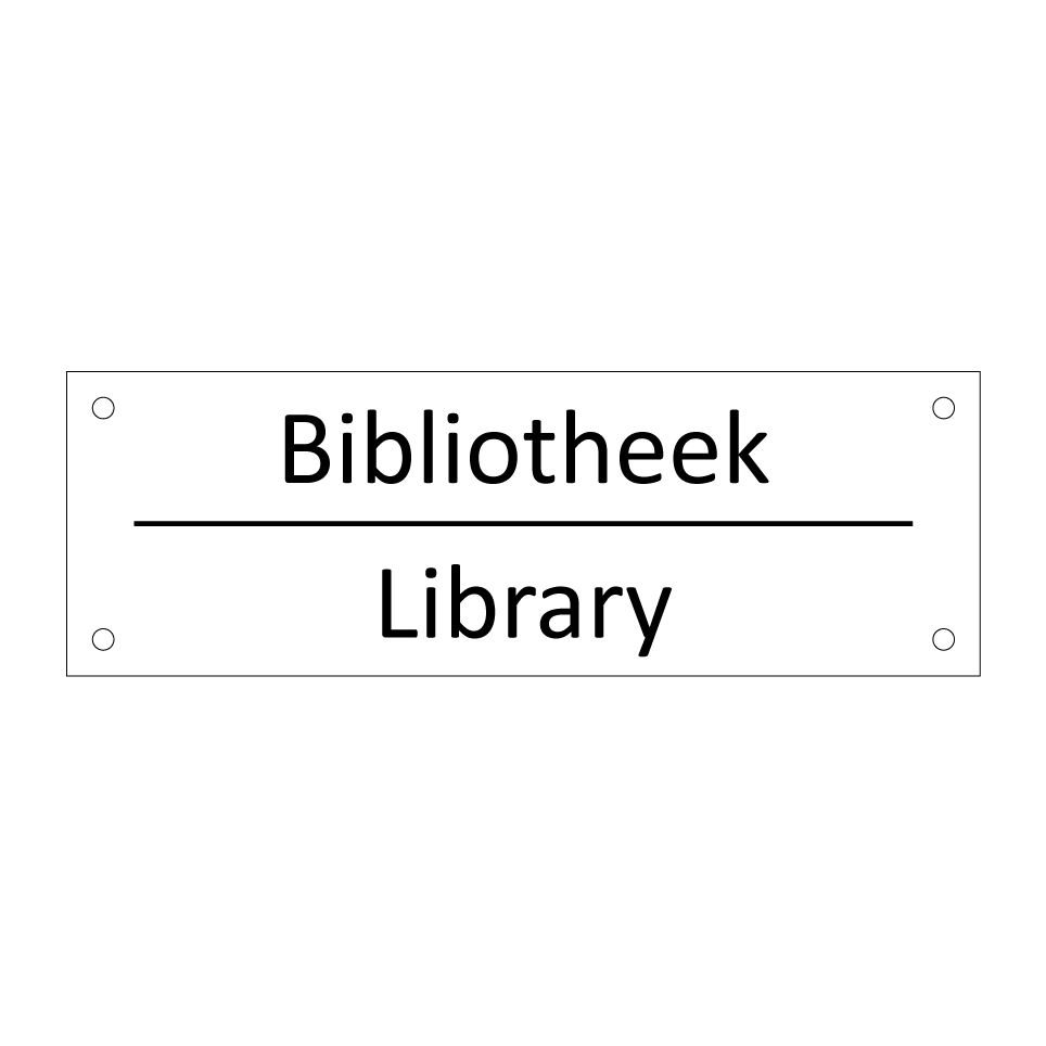 Informatiebord met tekst in het nederlands en engels. Dit bord luidt: Bibliotheek evenals met de engelse vertaling Library.