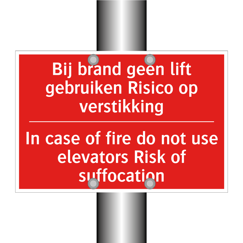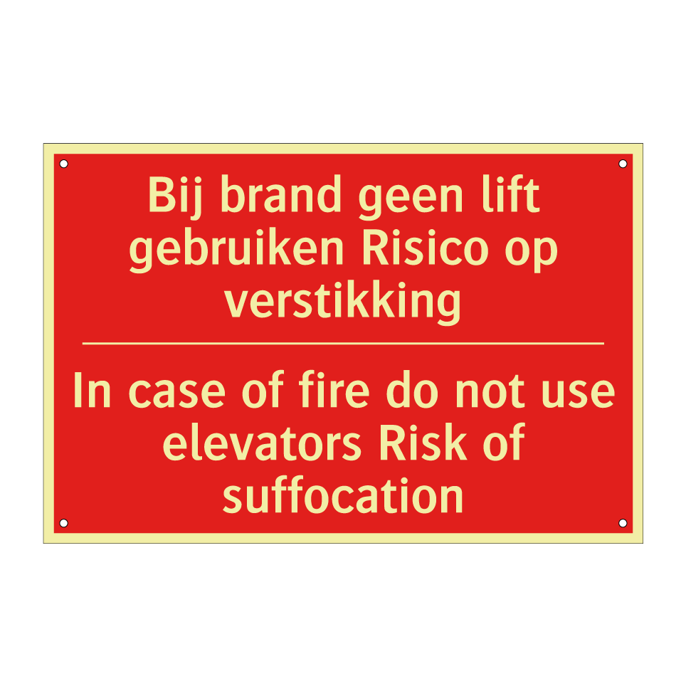 Brandbord met tekst Bij brand geen lift gebruiken Risico op verstikking - In case of fire do not use elevators Risk of suffocation