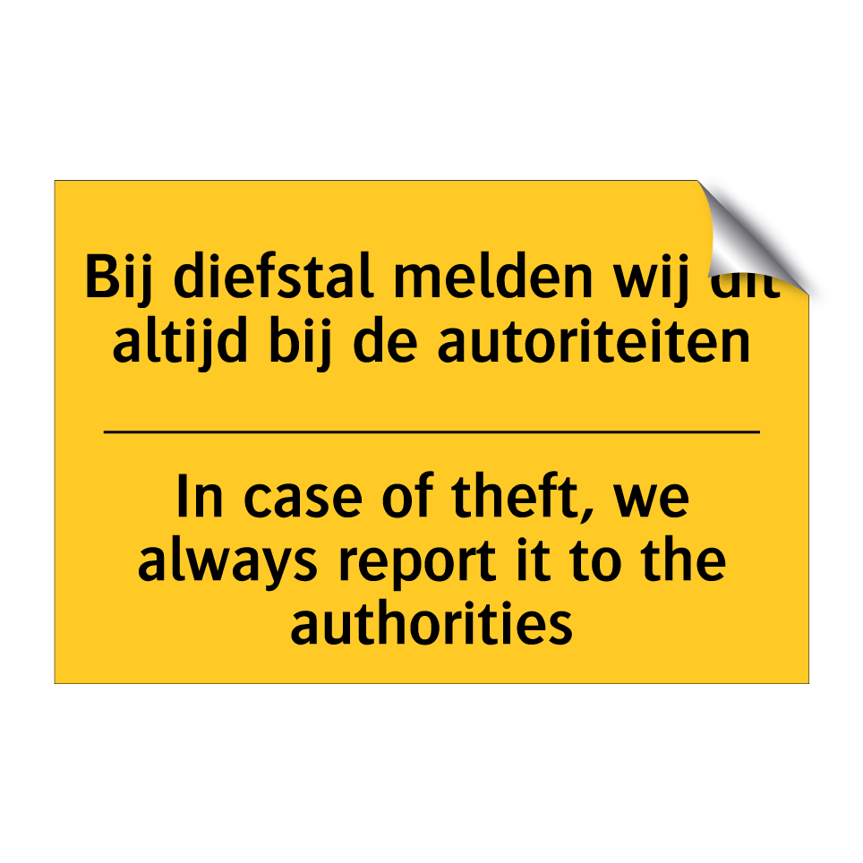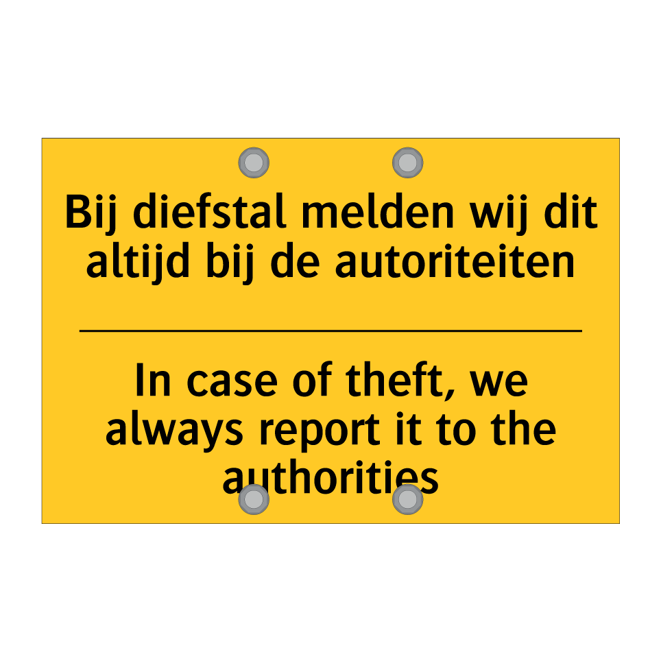 Waarschuwingsbord met de tekst Bij diefstal melden wij dit altijd bij de autoriteiten / In case of theft, we always report it to the authorities
