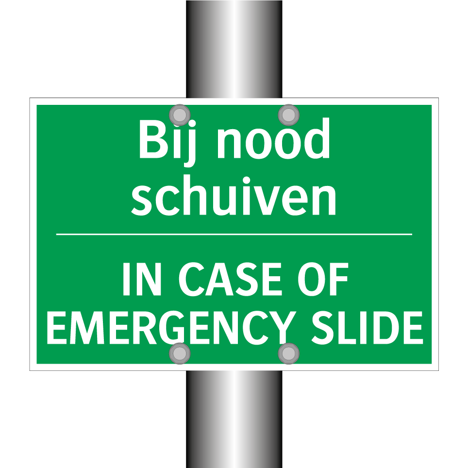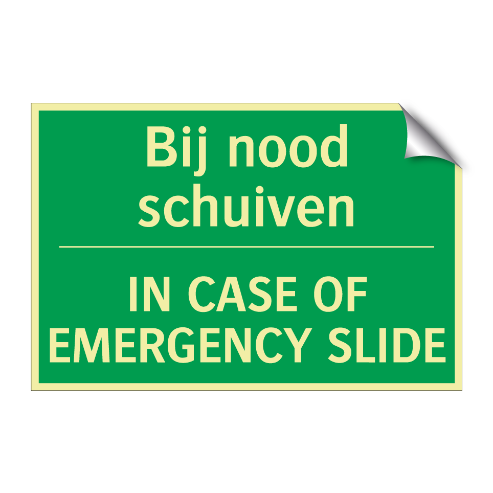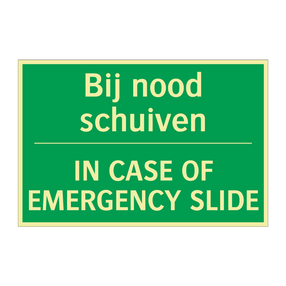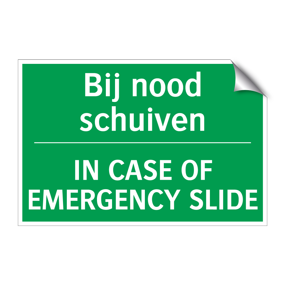 Noodbord met tekst Bij nood schuiven / IN CASE OF EMERGENCY SLIDE
