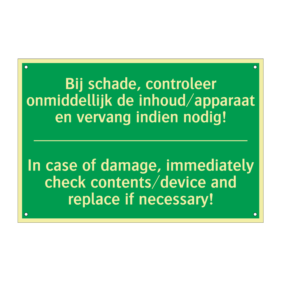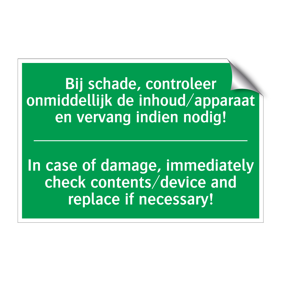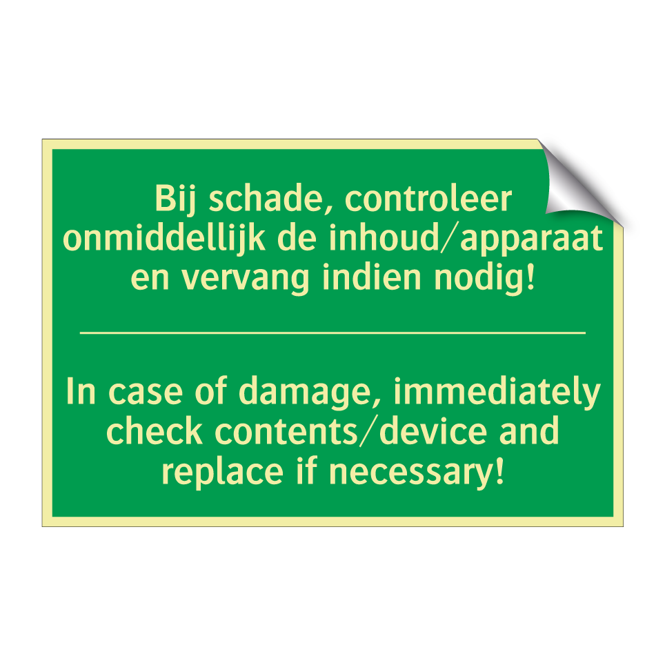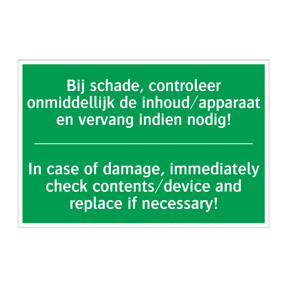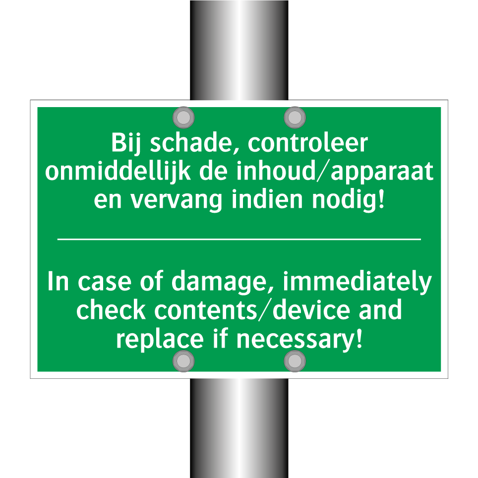 Noodbord met tekst Bij schade, controleer onmiddellijk de inhoud/apparaat en vervang indien nodig! / In case of damage, immediately check contents/device and replace if necessary!