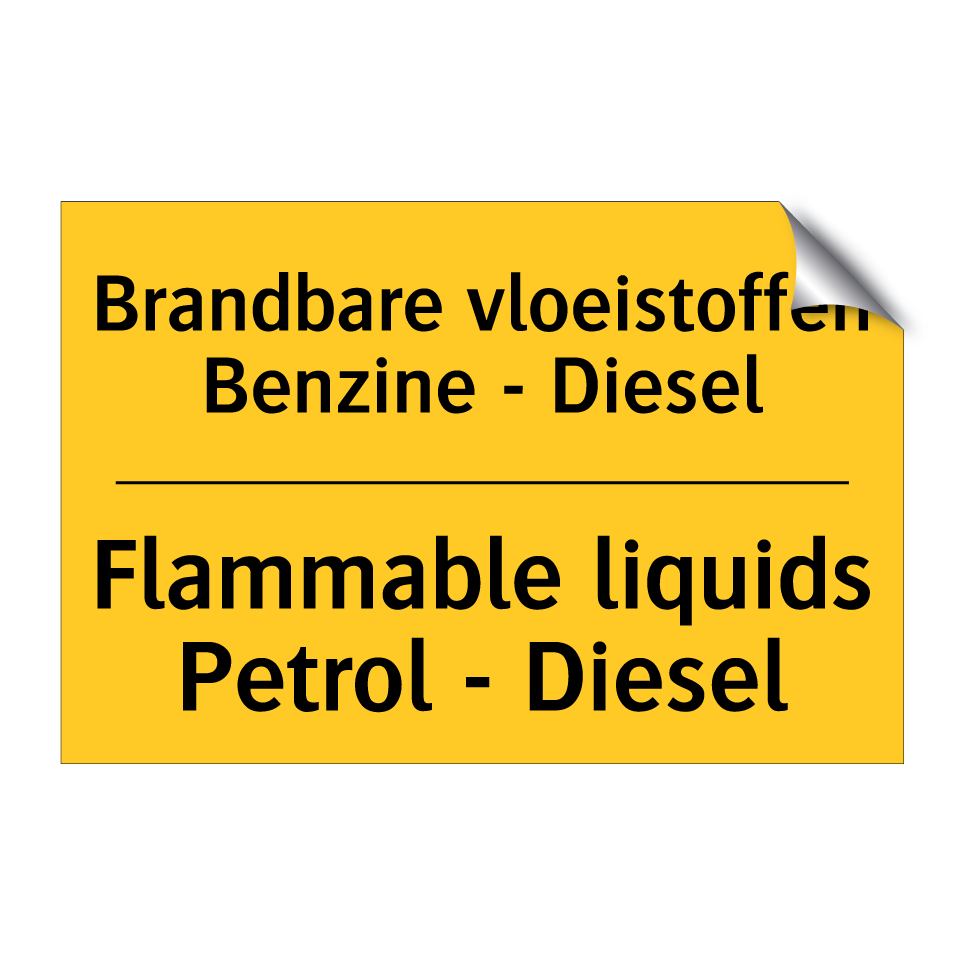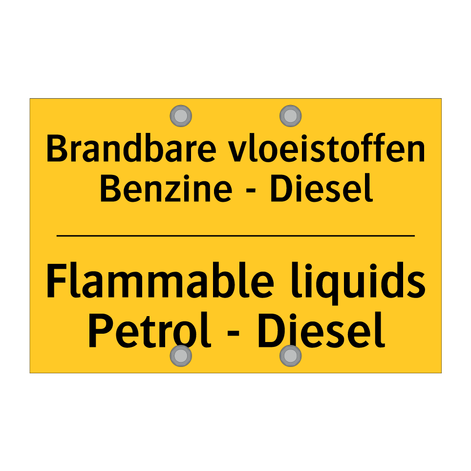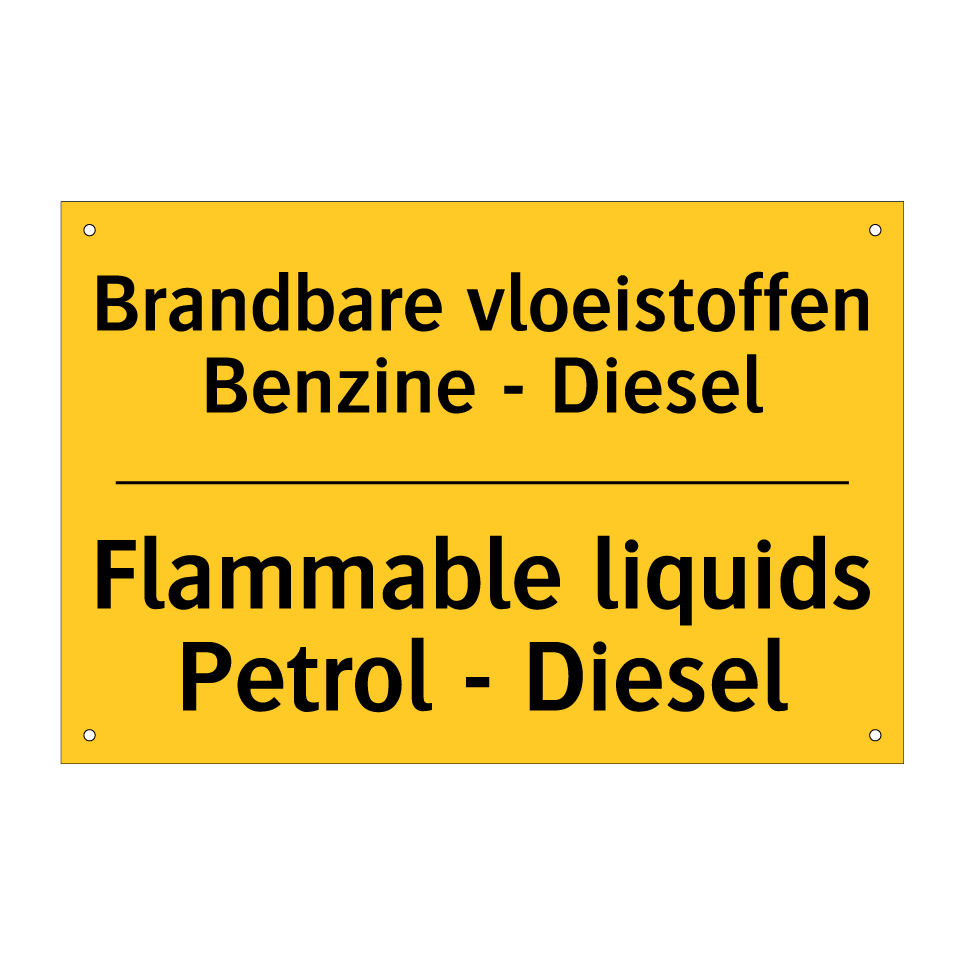 Waarschuwingsbord met de tekst Brandbare vloeistoffen Benzine - Diesel / Flammable liquids Petrol - Diesel
