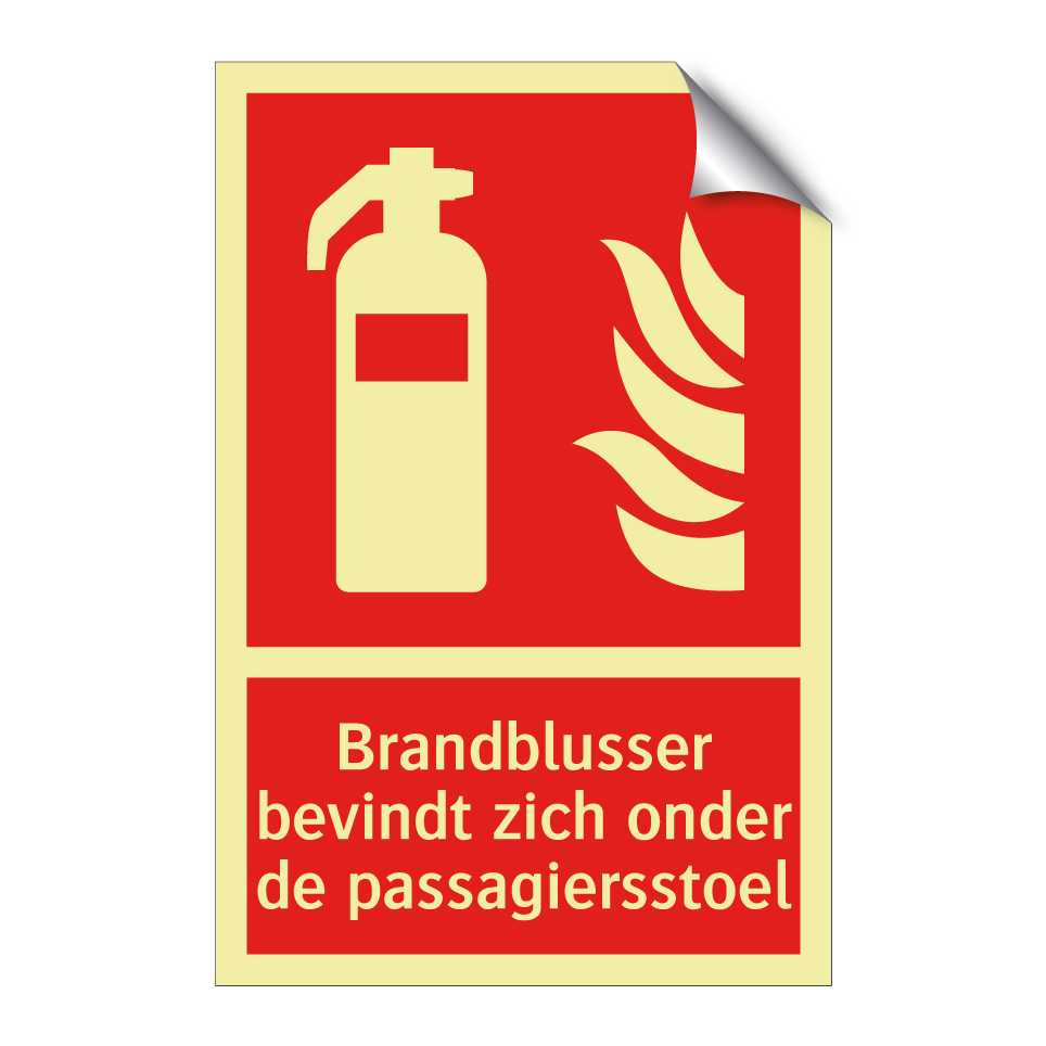 Brandbord met tekst Brandblusser bevindt zich onder de passagiersstoel