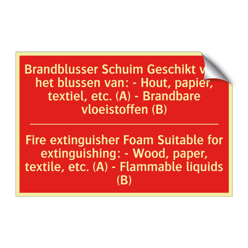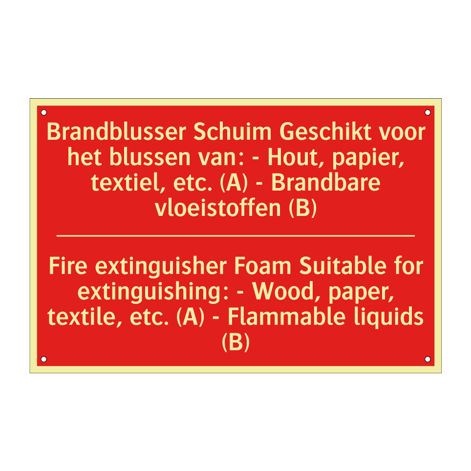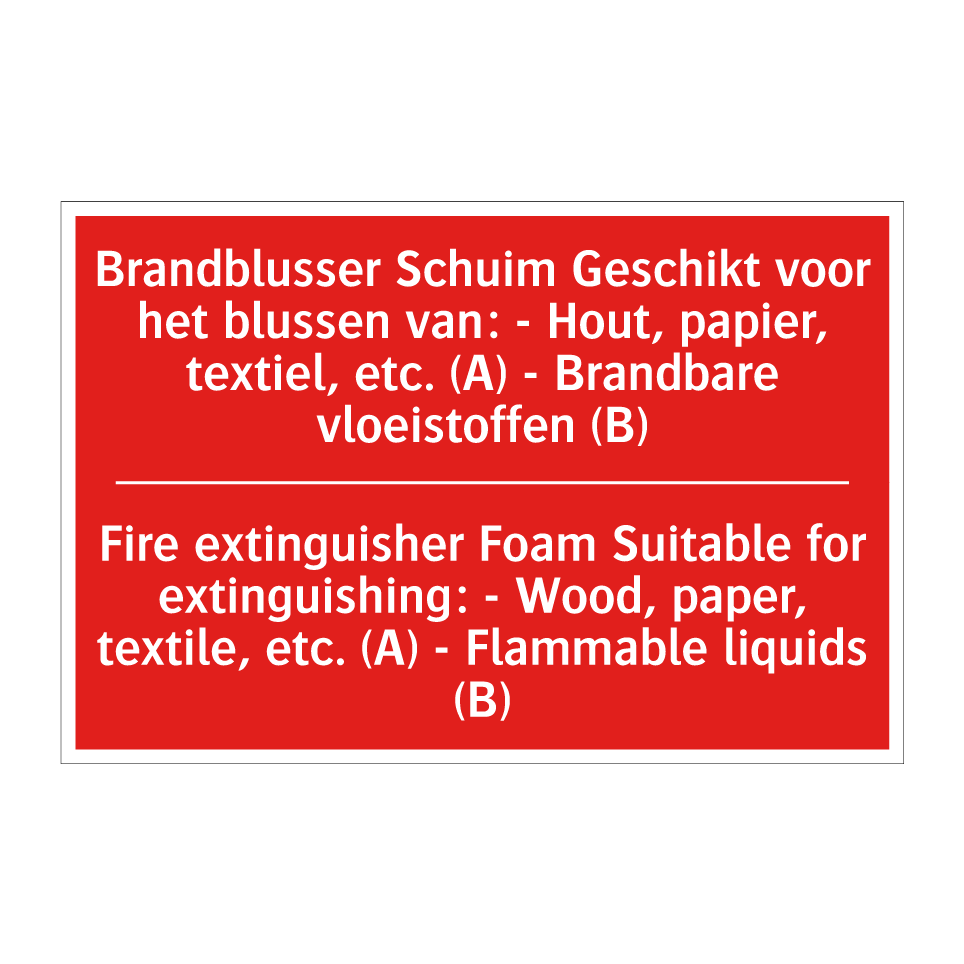 Brandbord met tekst Brandblusser Schuim Geschikt voor het blussen van: - Hout, papier, textiel, etc. (A) - Brandbare vloeistoffen (B) / Fire extinguisher Foam Suitable for extinguishing: - Wood, paper, textile, etc. (A) - Flammable liquids (B)