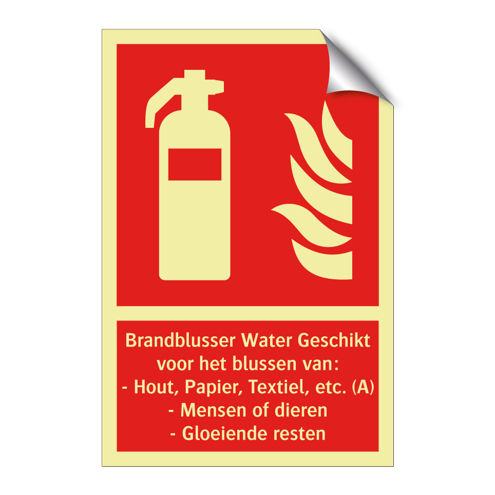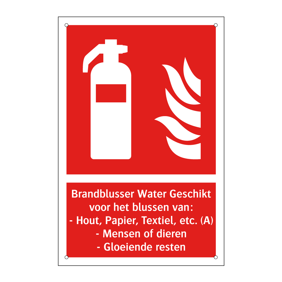 Brandbord met tekst Brandblusser Water Geschikt voor het blussen van: - Hout, Papier, Textiel, etc. (A) - Mensen of dieren - Gloeiende resten