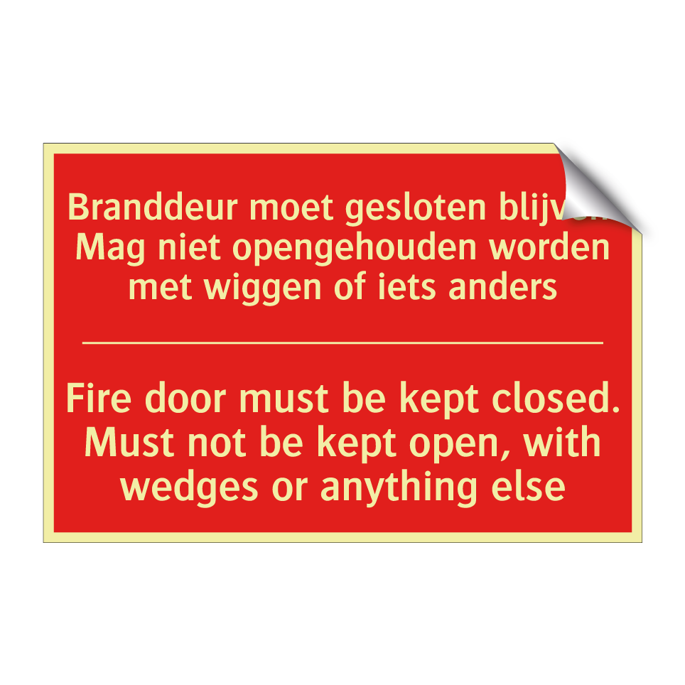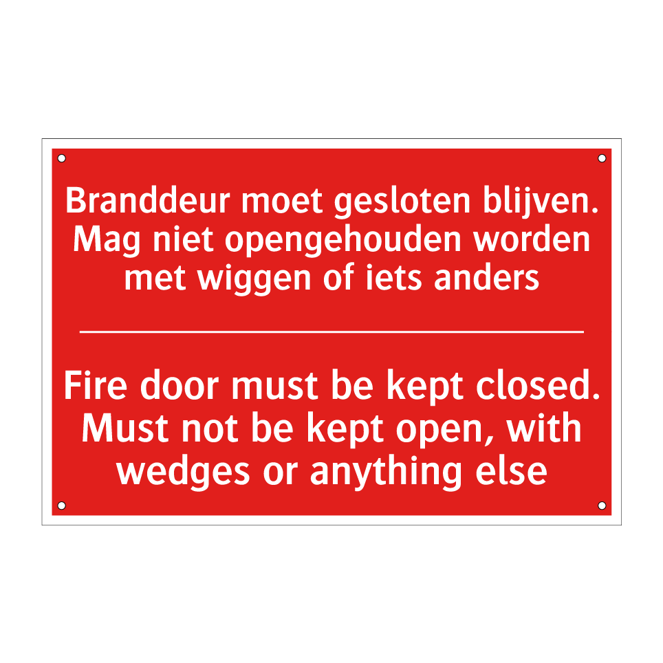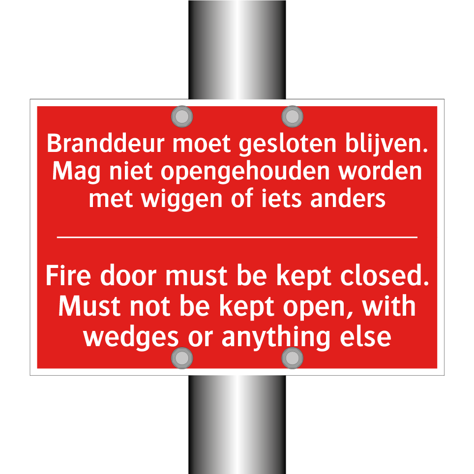 Brandbord met tekst Branddeur moet gesloten blijven. Mag niet opengehouden worden met wiggen of iets anders / Fire door must be kept closed. Must not be kept open, with wedges or anything else