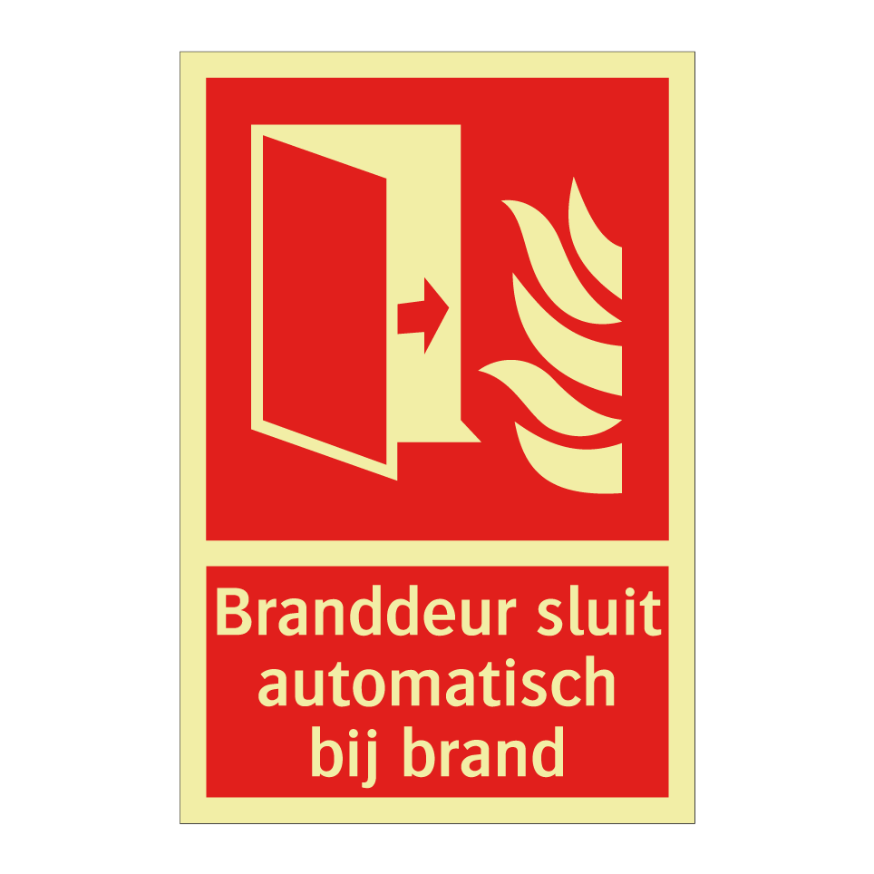 Brandbord met tekst Branddeur sluit automatisch bij brand