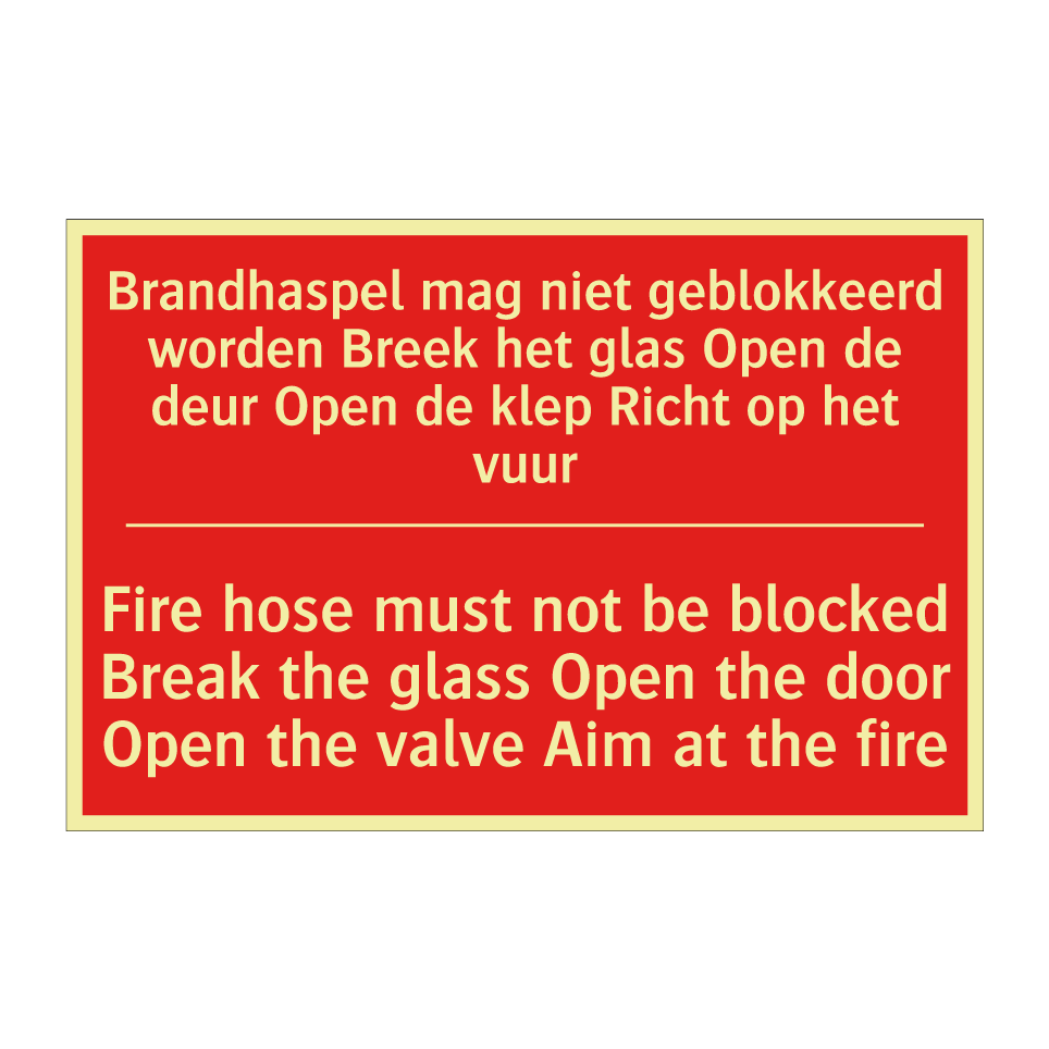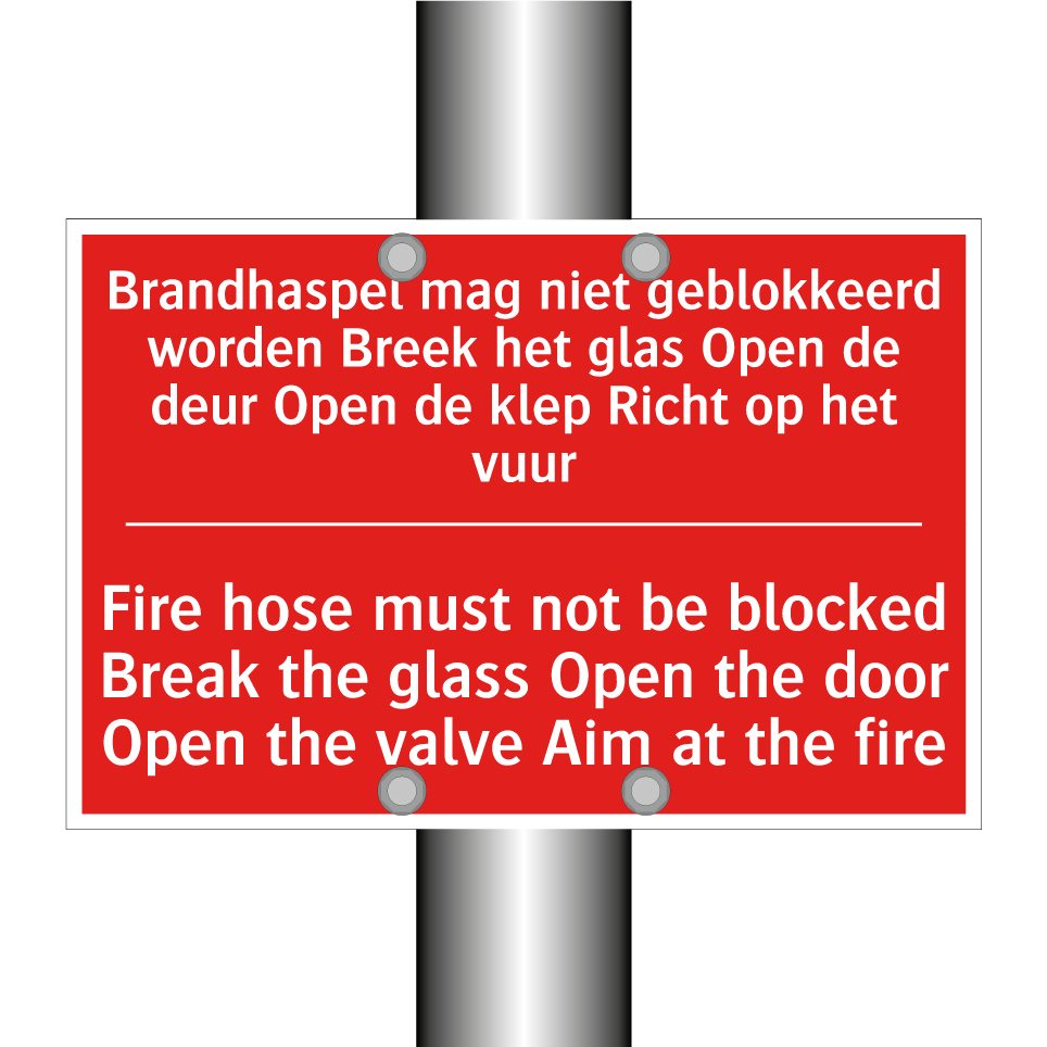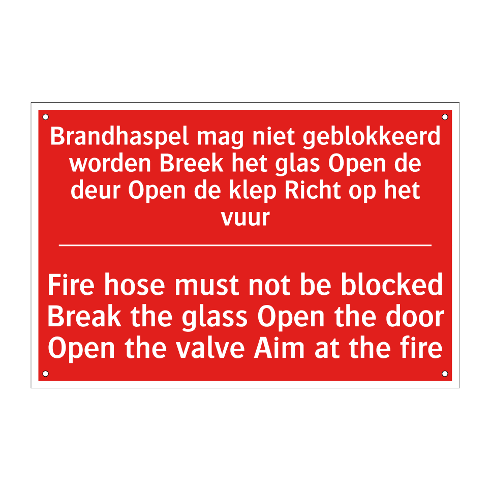Brandbord met tekst Brandhaspel mag niet geblokkeerd worden Breek het glas Open de deur Open de klep Richt op het vuur / Fire hose must not be blocked Break the glass Open the door Open the valve Aim at the fire