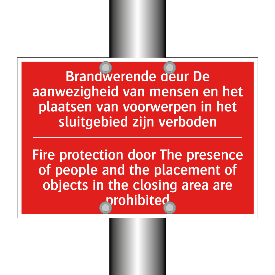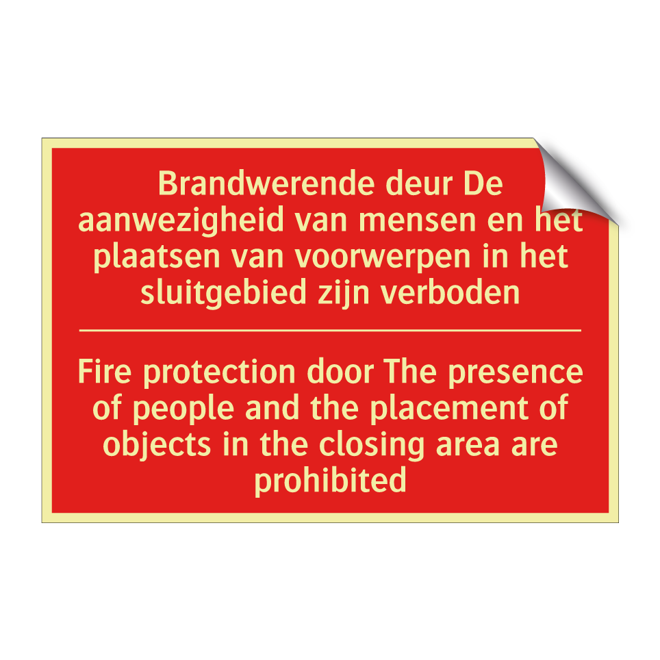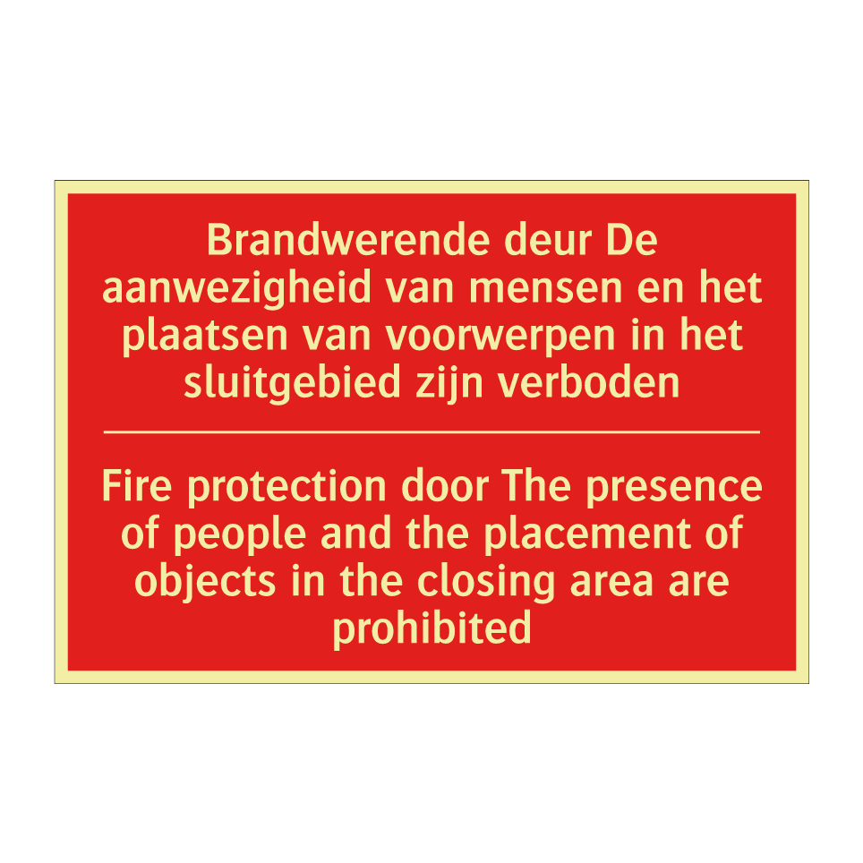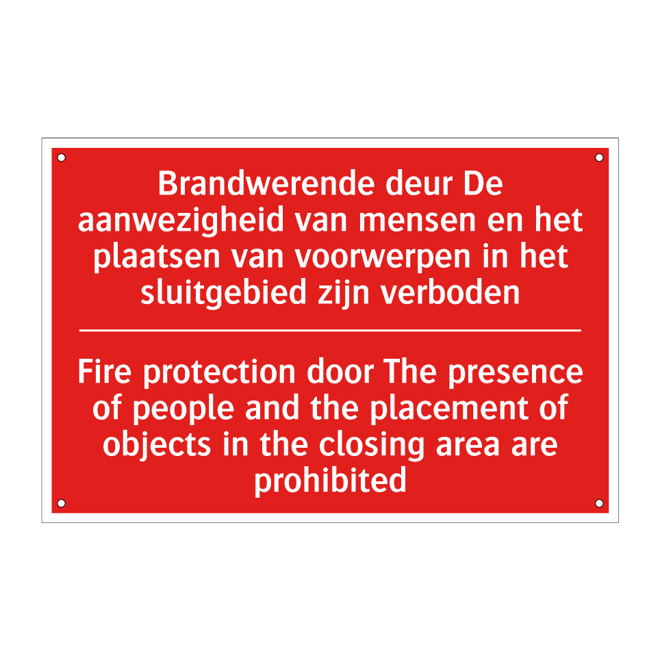 Brandbord met tekst Brandwerende deur De aanwezigheid van mensen en het plaatsen van voorwerpen in het sluitgebied zijn verboden / Fire protection door The presence of people and the placement of objects in the closing area are prohibited