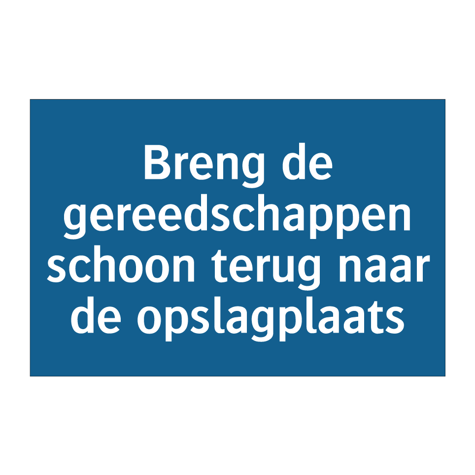 Deze verplichte bord is ideaal voor werkplaatsen, magazijnen en industriële omgevingen waar het essentieel is om gereedschappen schoon en georganiseerd te houden. Door deze bord op strategische plaatsen te monteren, zoals bij de ingang van de opslagruimte of in de buurt van werkstations, wordt personeel eraan herinnerd om gereedschappen netjes terug te brengen. Dit bevordert niet alleen de netheid, maar ook de efficiëntie en veiligheid op de werkvloer. De duidelijke blauwe achtergrond met witte tekst zorgt ervoor dat de boodschap goed zichtbaar is, zelfs van een afstand. Plaats deze bord op ooghoogte voor maximale effectiviteit.