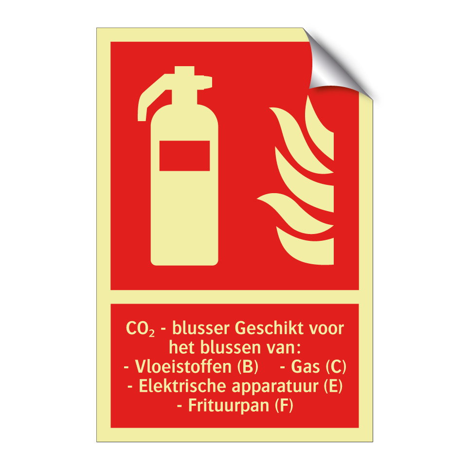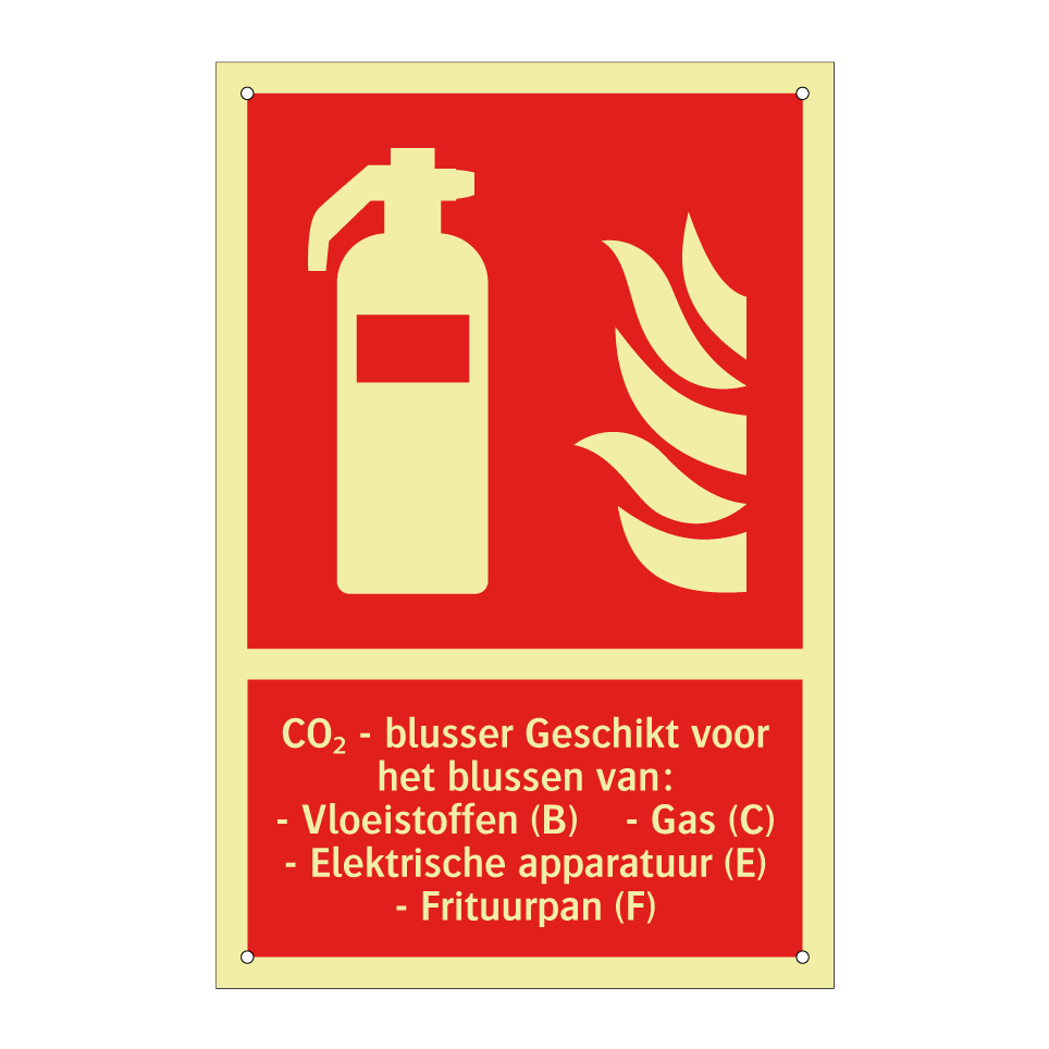 Brandbord met tekst CO₂ - blusser Geschikt voor het blussen van: - Vloeistoffen (B) - Gas (C) - Elektrische apparatuur (E) - Frituurpan (F)