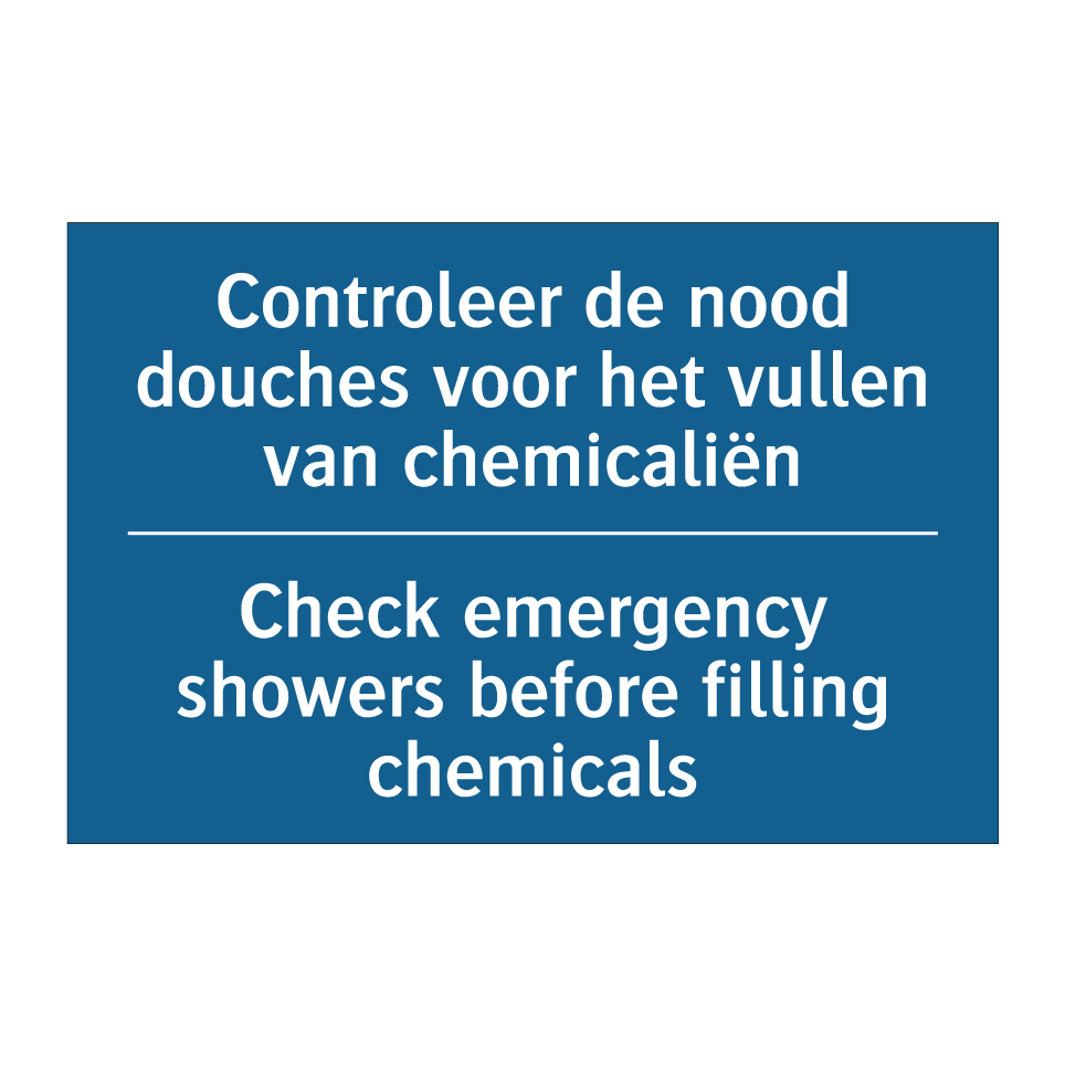 Dit verplichte bord is essentieel voor een veilige werkomgeving in industriële en laboratoriumomgevingen. Het bord herinnert personeel eraan om de nood douches te controleren voordat ze beginnen met het vullen van chemicaliën, wat cruciaal is voor het waarborgen van de veiligheid. Dankzij de tweetalige tekst in het Nederlands en Engels, is het bord geschikt voor internationale werkplekken en bevordert het duidelijke communicatie onder werknemers van verschillende nationaliteiten. Plaats dit bord op zichtbare locaties in de buurt van chemische opslagruimtes of productiefaciliteiten om ervoor te zorgen dat iedereen op de hoogte is van de veiligheidsprocedures. Het gebruik van dit verplichte bord helpt bij het minimaliseren van risico's en het bevorderen van een veilige werkomgeving.