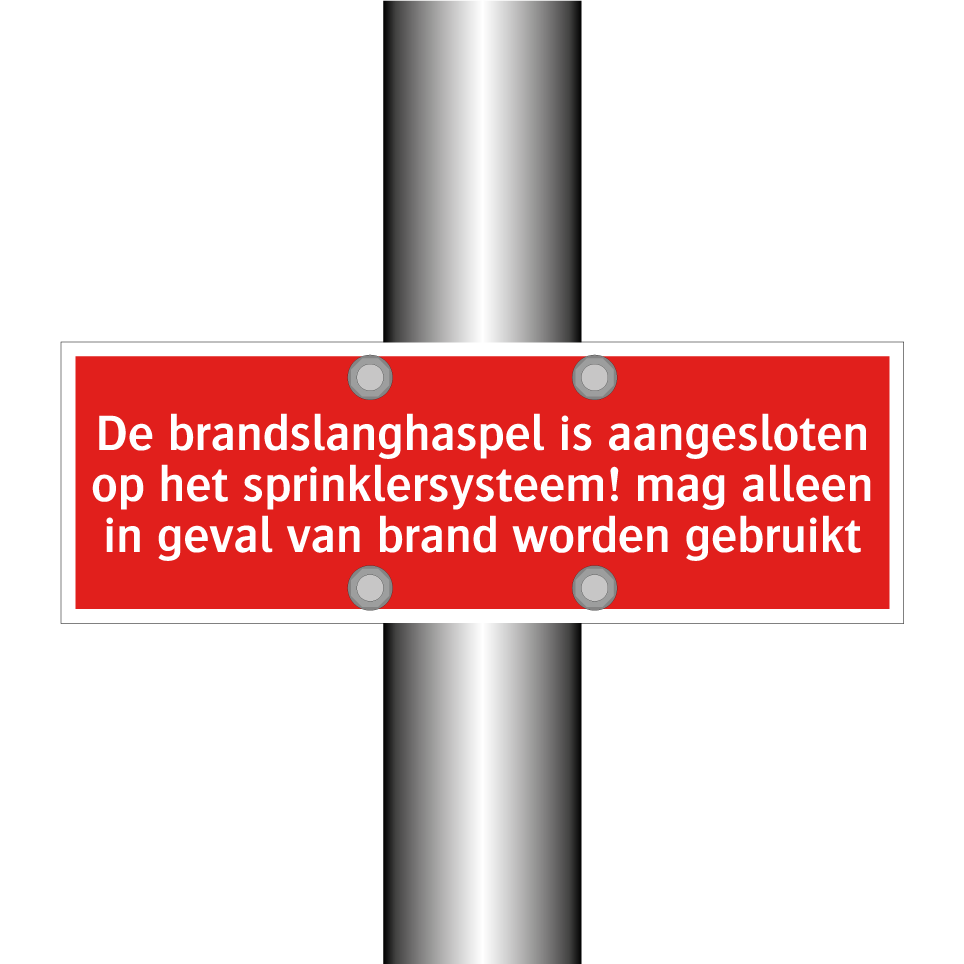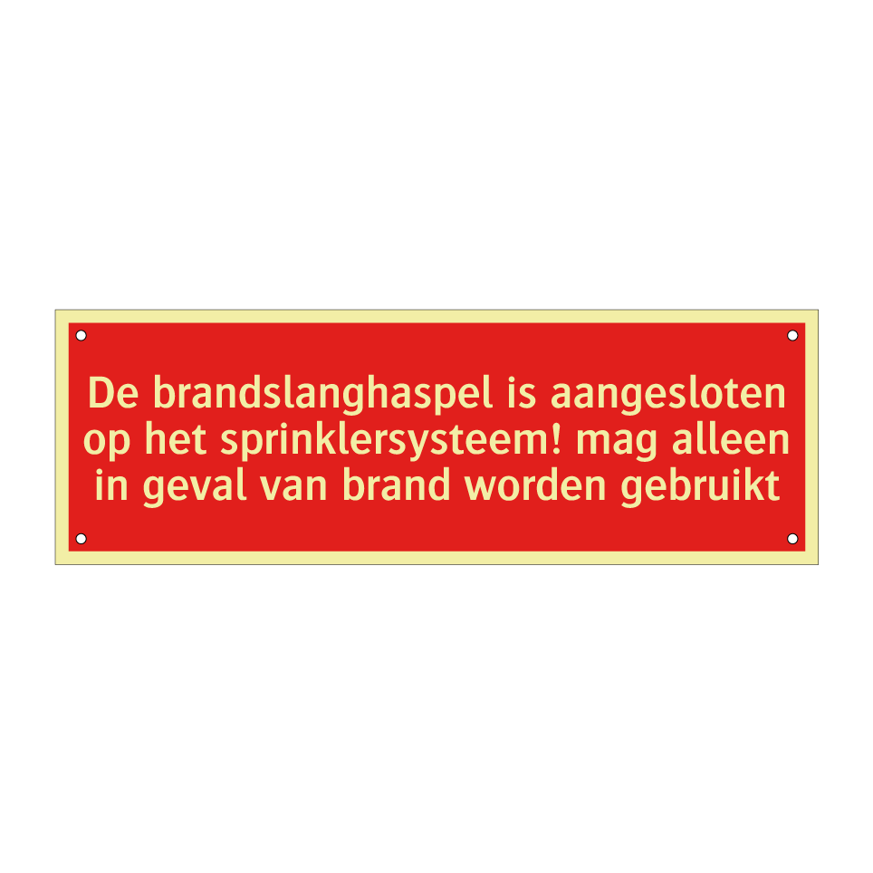 Brandbord met tekst De brandslanghaspel is aangesloten op het sprinklersysteem! mag alleen in geval van brand worden gebruikt