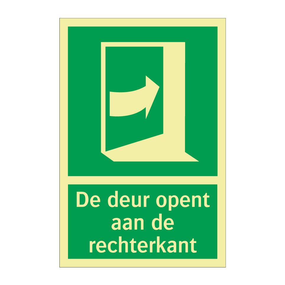 Deze noodbord is essentieel voor de veiligheid in noodsituaties. Het geeft duidelijk aan dat de deur aan de rechterkant opent, wat cruciale informatie kan zijn tijdens een evacuatie. Dit bordje is ideaal voor gebruik in kantoren, scholen, ziekenhuizen en andere openbare gebouwen waar snelle en efficiënte evacuatie noodzakelijk is. Plaats het noodbord bij uitgangen, gangen en andere strategische locaties om ervoor te zorgen dat iedereen snel en veilig de juiste route kan vinden. De groene achtergrond met witte tekst en een duidelijke symbool zorgt voor maximale zichtbaarheid, zelfs in stressvolle situaties.