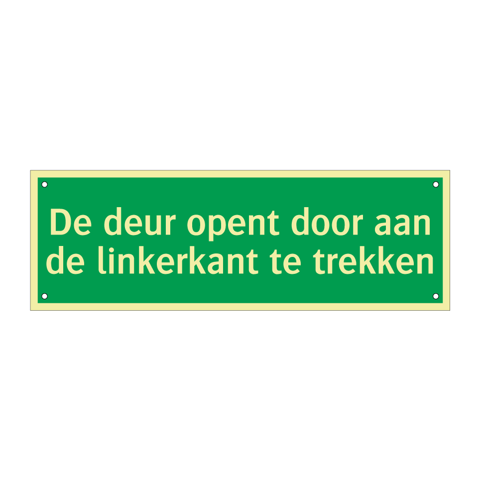 Deze noodbord is essentieel voor de veiligheid in noodsituaties. Het geeft duidelijk aan dat de deur aan de linkerkant moet worden getrokken om te openen, wat cruciaal kan zijn tijdens een evacuatie. Dit bordje is ideaal voor gebruik in openbare gebouwen zoals kantoren, scholen, ziekenhuizen en winkelcentra. Plaats het op goed zichtbare locaties bij nooduitgangen en vluchtwegen om ervoor te zorgen dat iedereen snel en veilig kan ontsnappen. Door de groene achtergrond en witte tekst is het bord gemakkelijk te herkennen en te begrijpen, zelfs in stressvolle situaties.