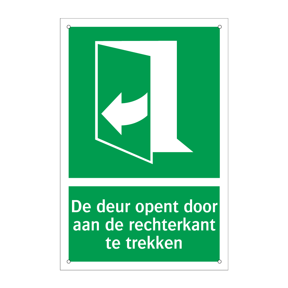 Deze noodbord is essentieel voor de veiligheid in noodsituaties. Het geeft duidelijk aan dat de deur opent door aan de rechterkant te trekken, wat cruciaal is voor een snelle evacuatie. Dit bordje kan strategisch worden geplaatst bij nooduitgangen, in gangen, trappenhuizen en andere vluchtroutes. Het helpt mensen snel en efficiënt de juiste richting te vinden tijdens een noodsituatie. Door de opvallende groene kleur en witte tekst is het bord gemakkelijk te herkennen, zelfs in stressvolle omstandigheden. Ideaal voor gebruik in kantoren, scholen, ziekenhuizen en openbare gebouwen.