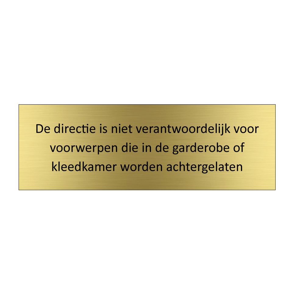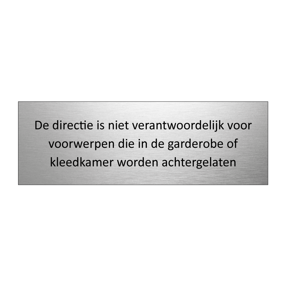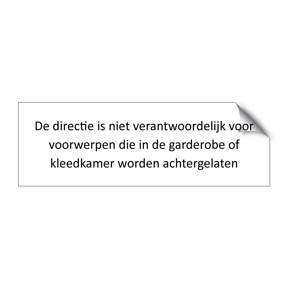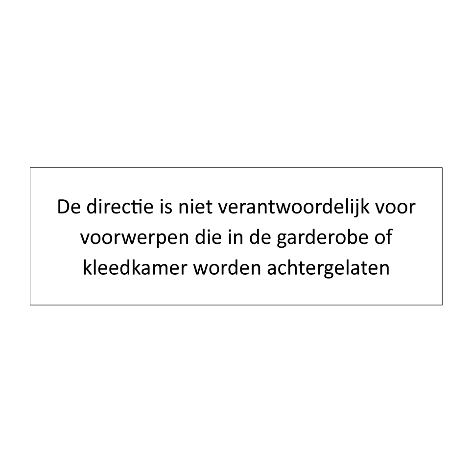 Informatiebord met tekst De directie is niet verantwoordelijk voor voorwerpen die in de garderobe of kleedkamer worden achtergelaten.