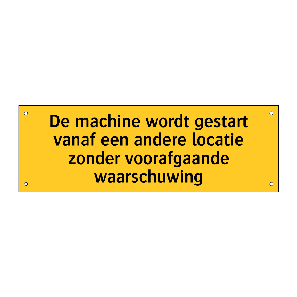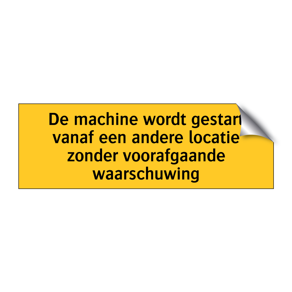 Waarschuwingsbord met de tekst De machine wordt gestart vanaf een andere locatie zonder voorafgaande waarschuwing
