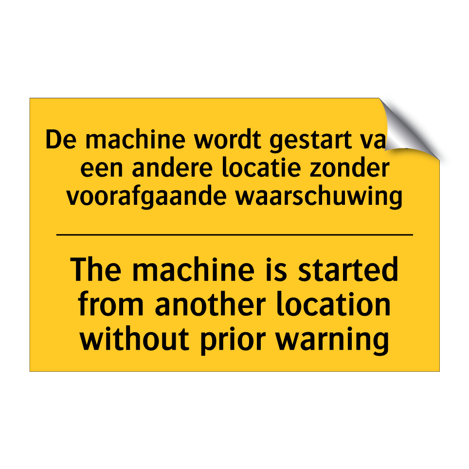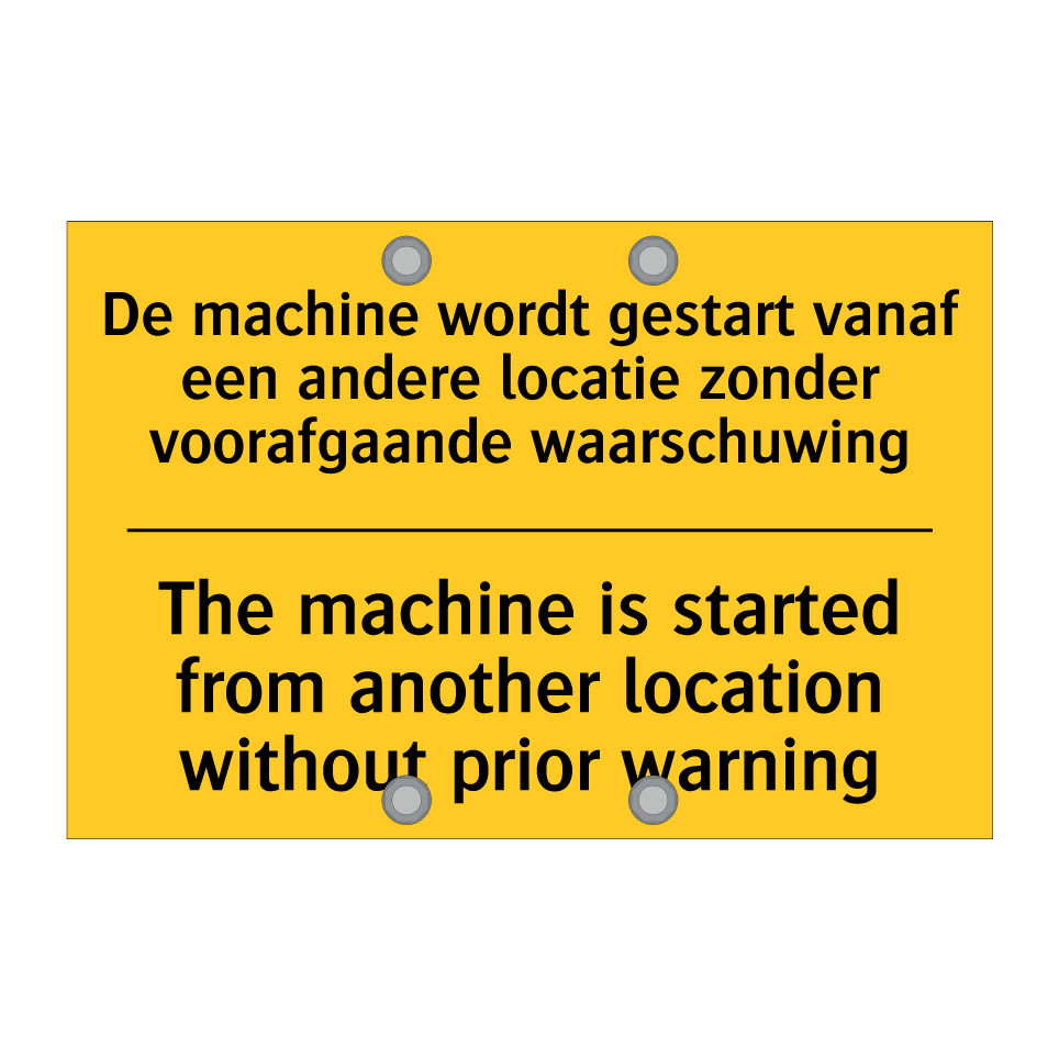 Waarschuwingsbord met de tekst De machine wordt gestart vanaf een andere locatie zonder voorafgaande waarschuwing / The machine is started from another location without prior warning