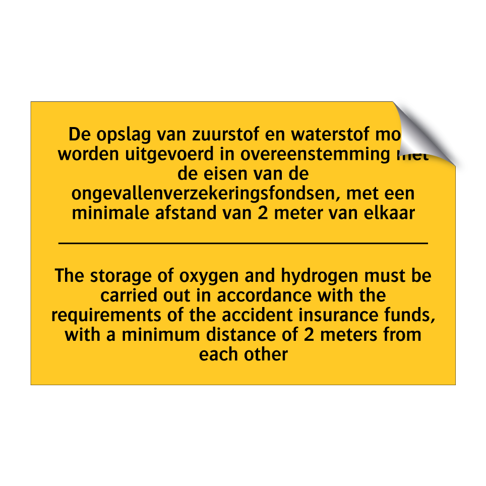 Waarschuwingsbord met de tekst De opslag van zuurstof en waterstof moet worden uitgevoerd in overeenstemming met de eisen van de ongevallenverzekeringsfondsen, met een minimale afstand van 2 meter van elkaar / The storage of oxygen and hydrogen must be carried out in accordance with the requirements of the accident insurance funds, with a minimum distance of 2 meters from each other