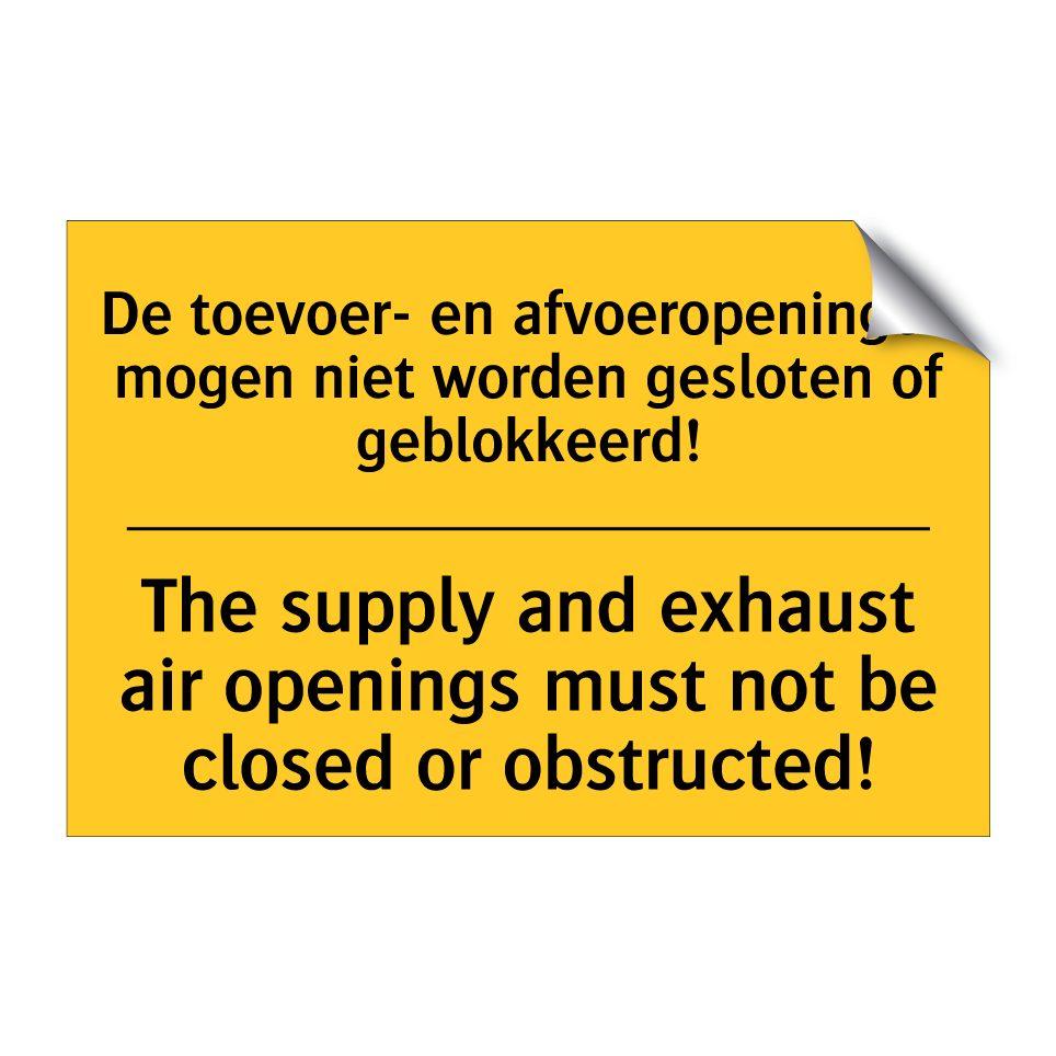 Waarschuwingsbord met de tekst De toevoer- en afvoeropeningen mogen niet worden gesloten of geblokkeerd! / The supply and exhaust air openings must not be closed or obstructed!