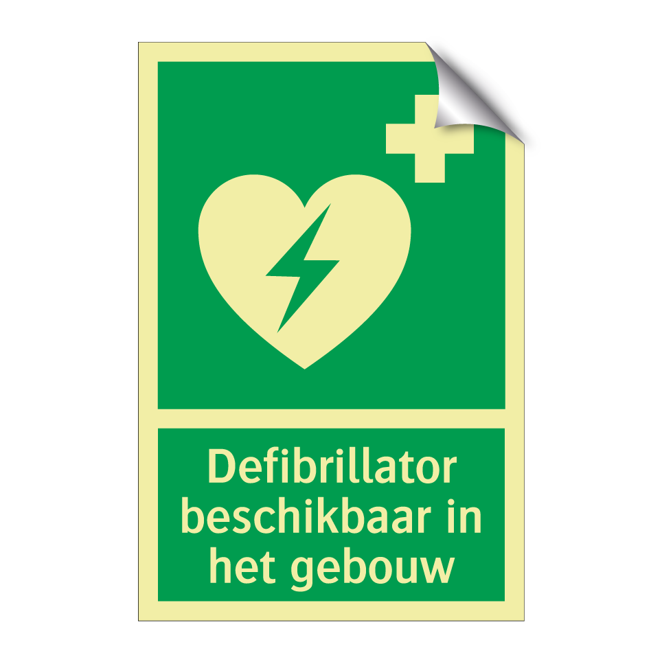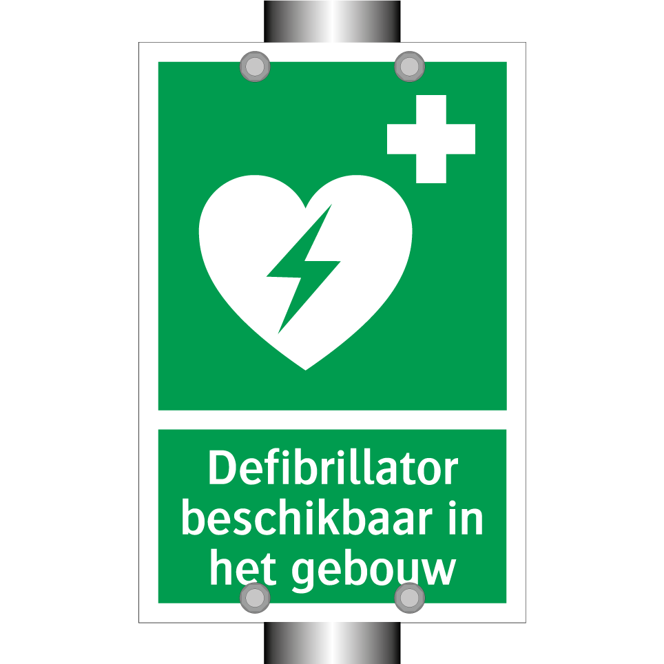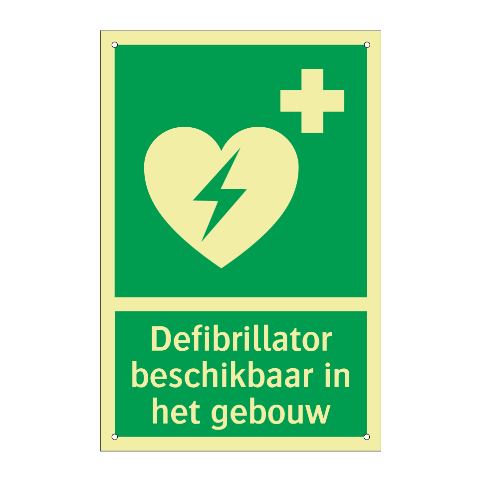 Noodbord met tekst Defibrillator beschikbaar in het gebouw