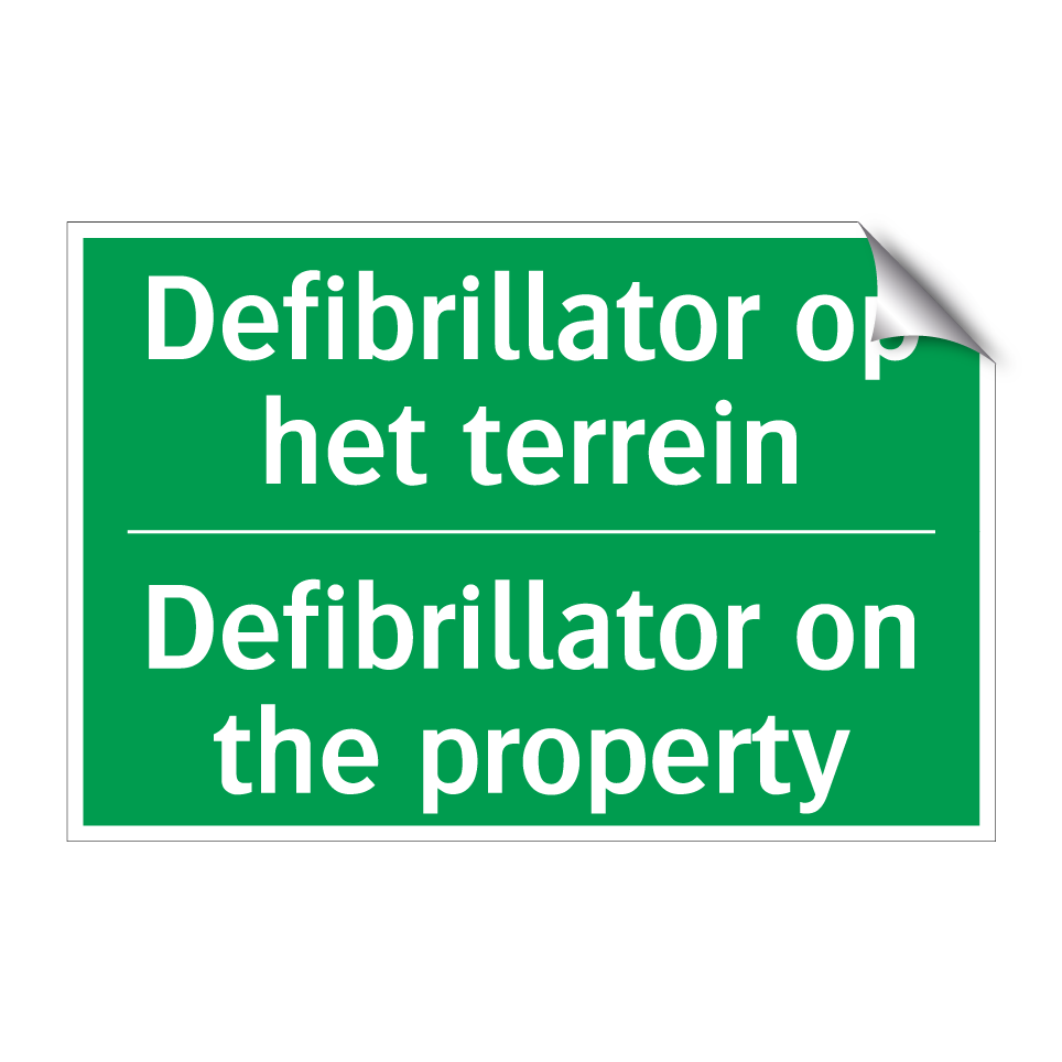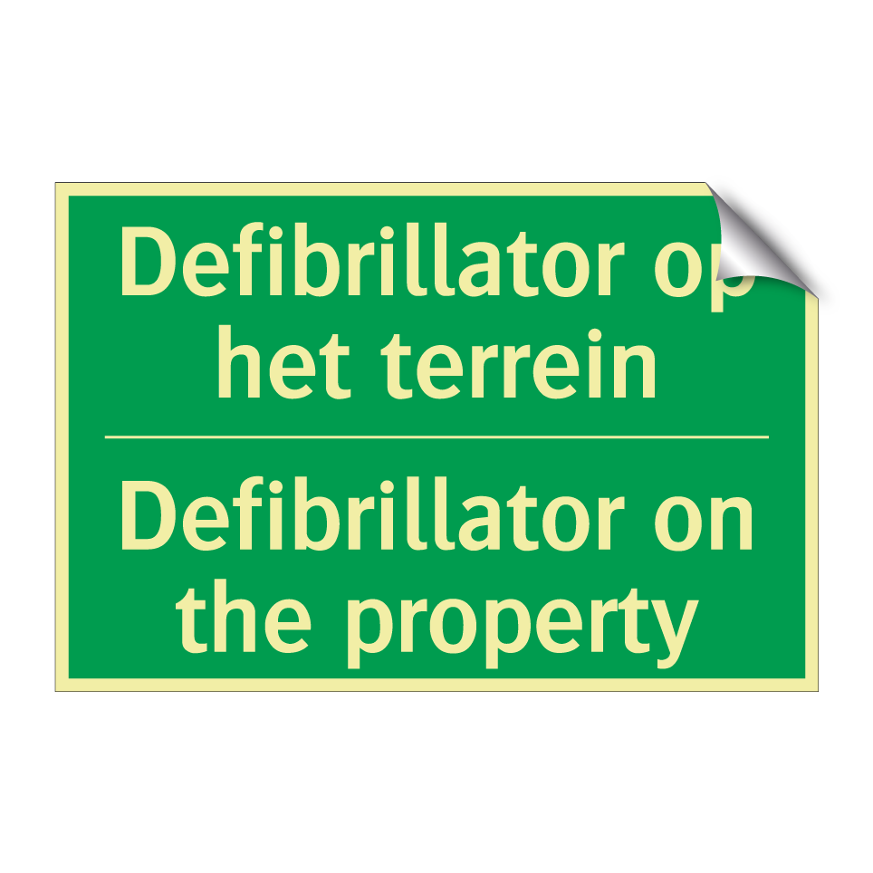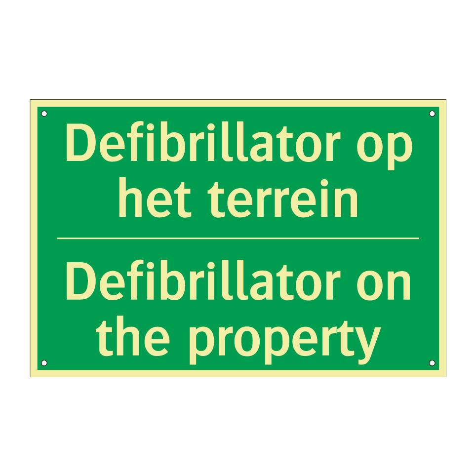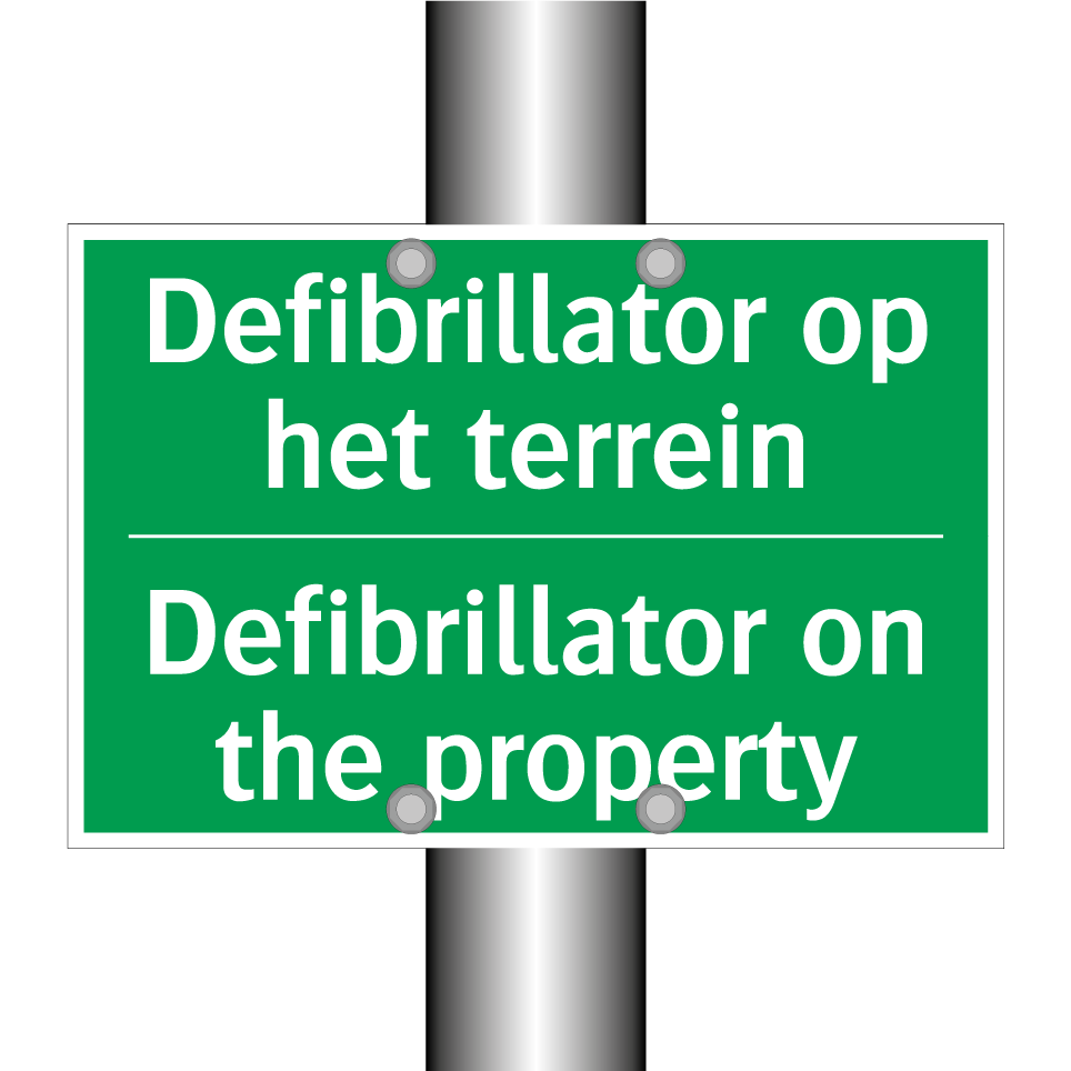 Noodbord met tekst Defibrillator op het terrein / Defibrillator on the property