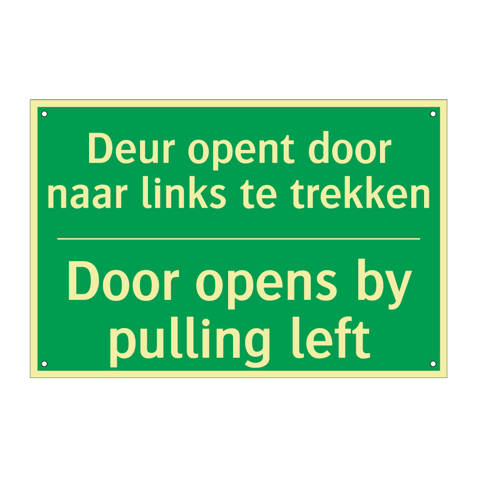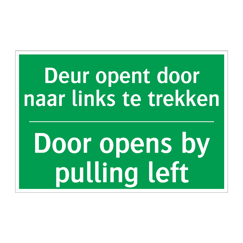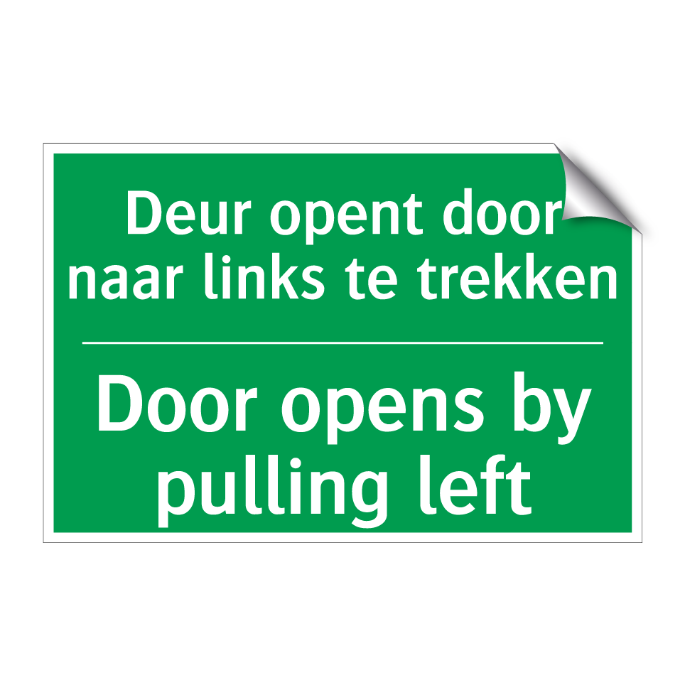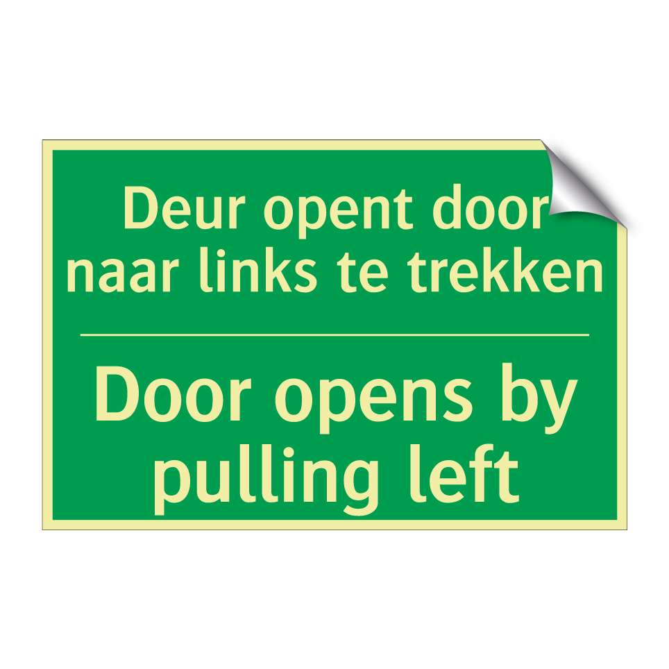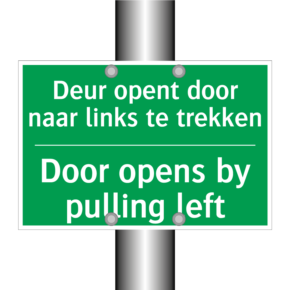Noodbord met tekst Deur opent door naar links te trekken / Door opens by pulling left