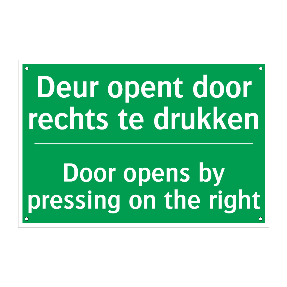 Noodbord met tekst Deur opent door rechts te drukken / Door opens by pressing on the right