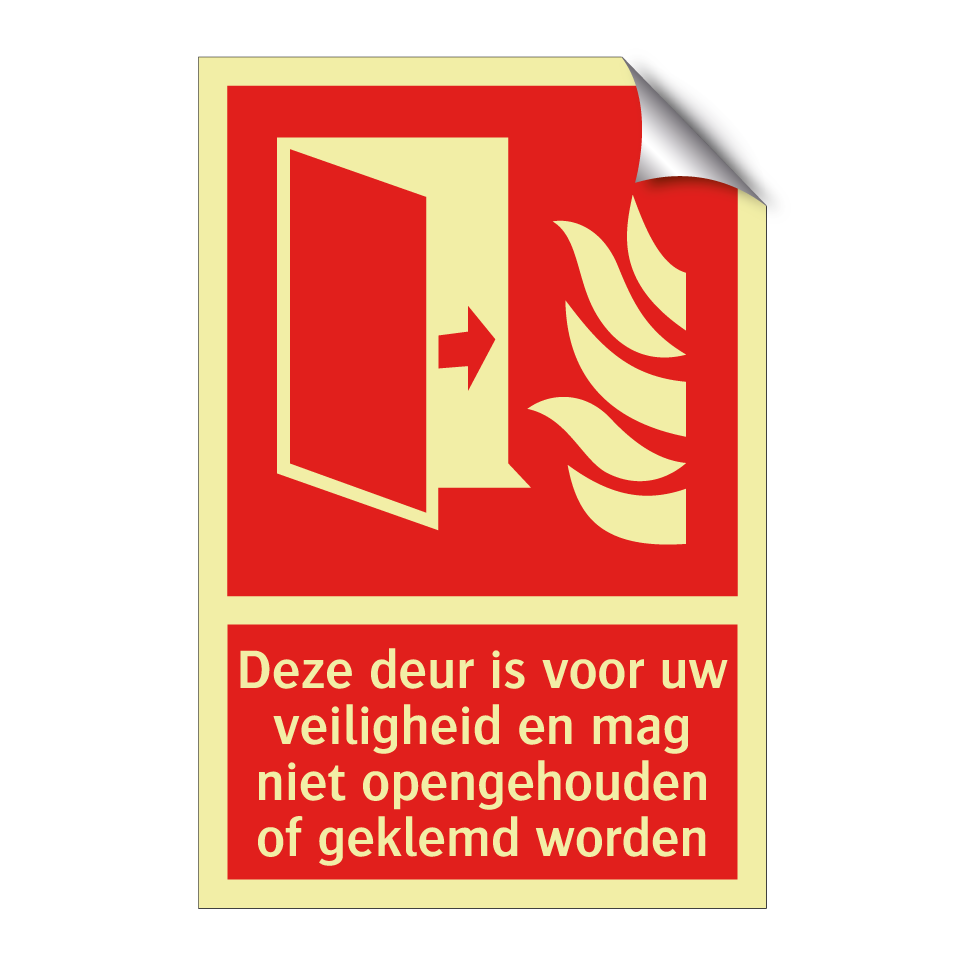 Brandbord met tekst Deze deur is voor uw veiligheid en mag niet opengehouden of geklemd worden