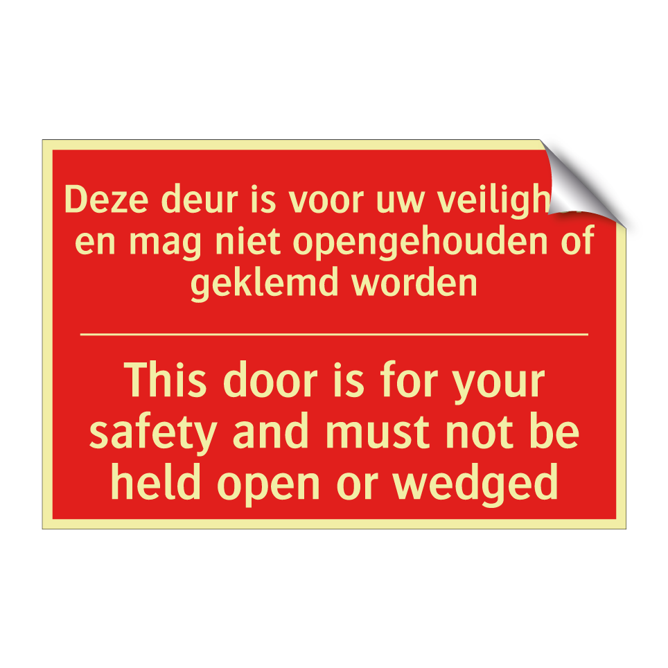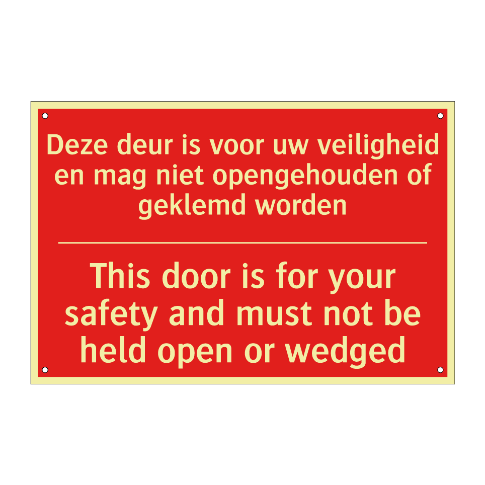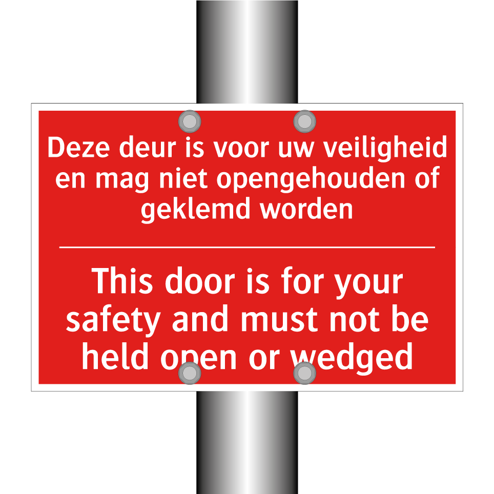 Brandbord met tekst Deze deur is voor uw veiligheid en mag niet opengehouden of geklemd worden / This door is for your safety and must not be held open or wedged