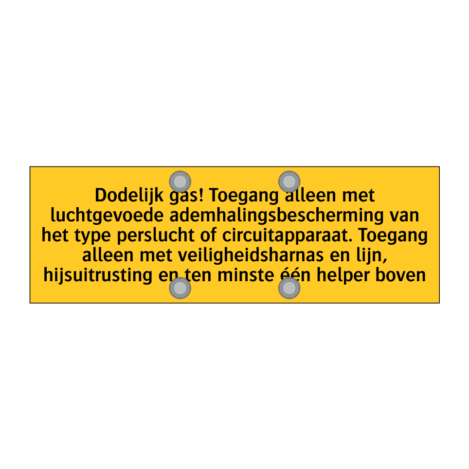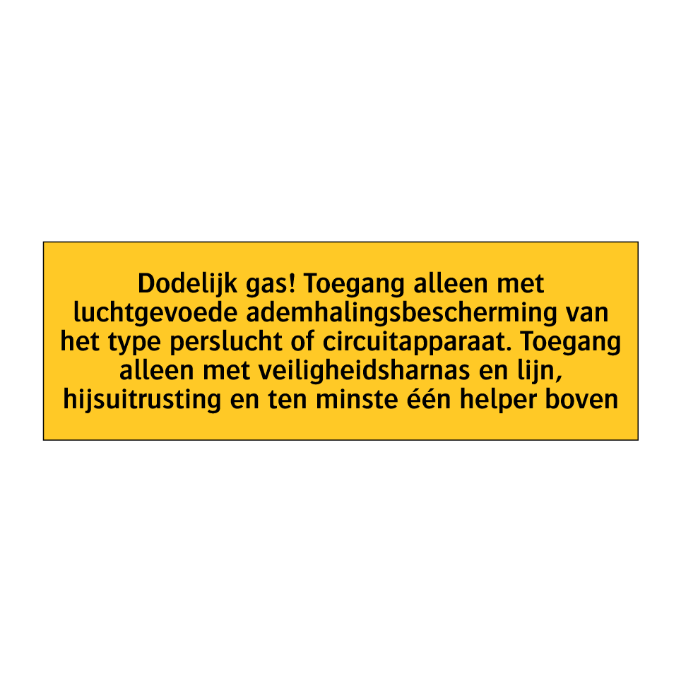 Waarschuwingsbord met de tekst Dodelijk gas! Toegang alleen met luchtgevoede ademhalingsbescherming van het type perslucht of circuitapparaat. Toegang alleen met veiligheidsharnas en lijn, hijsuitrusting en ten minste één helper boven