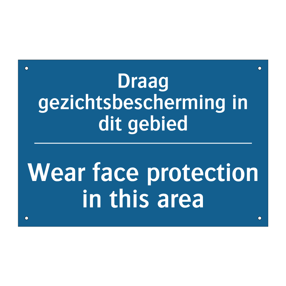 Deze verplichte bord is essentieel voor het waarborgen van de veiligheid in gebieden waar gezichtsbescherming noodzakelijk is. Met een opvallende blauwe achtergrond en witte tekst, trekt het direct de aandacht van werknemers en bezoekers. De tweetalige tekst, in zowel Nederlands als Engels, maakt het bord toegankelijk voor een breder publiek, wat vooral handig is in internationale omgevingen zoals fabrieken, bouwplaatsen en laboratoria. Door het strategisch te plaatsen bij ingangen of werkstations, herinnert het bord iedereen eraan om de juiste beschermingsmiddelen te dragen. Dit verplichte bord helpt bij het minimaliseren van risico's en bevordert een veilige werkomgeving.
