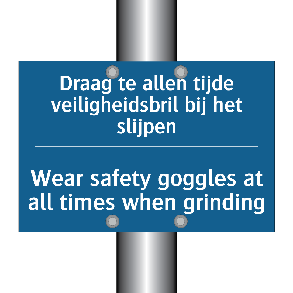 Verplichte bord met de tekst Draag te allen tijde veiligheidsbril bij het slijpen - Wear safety goggles at all times when grinding