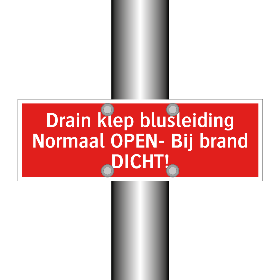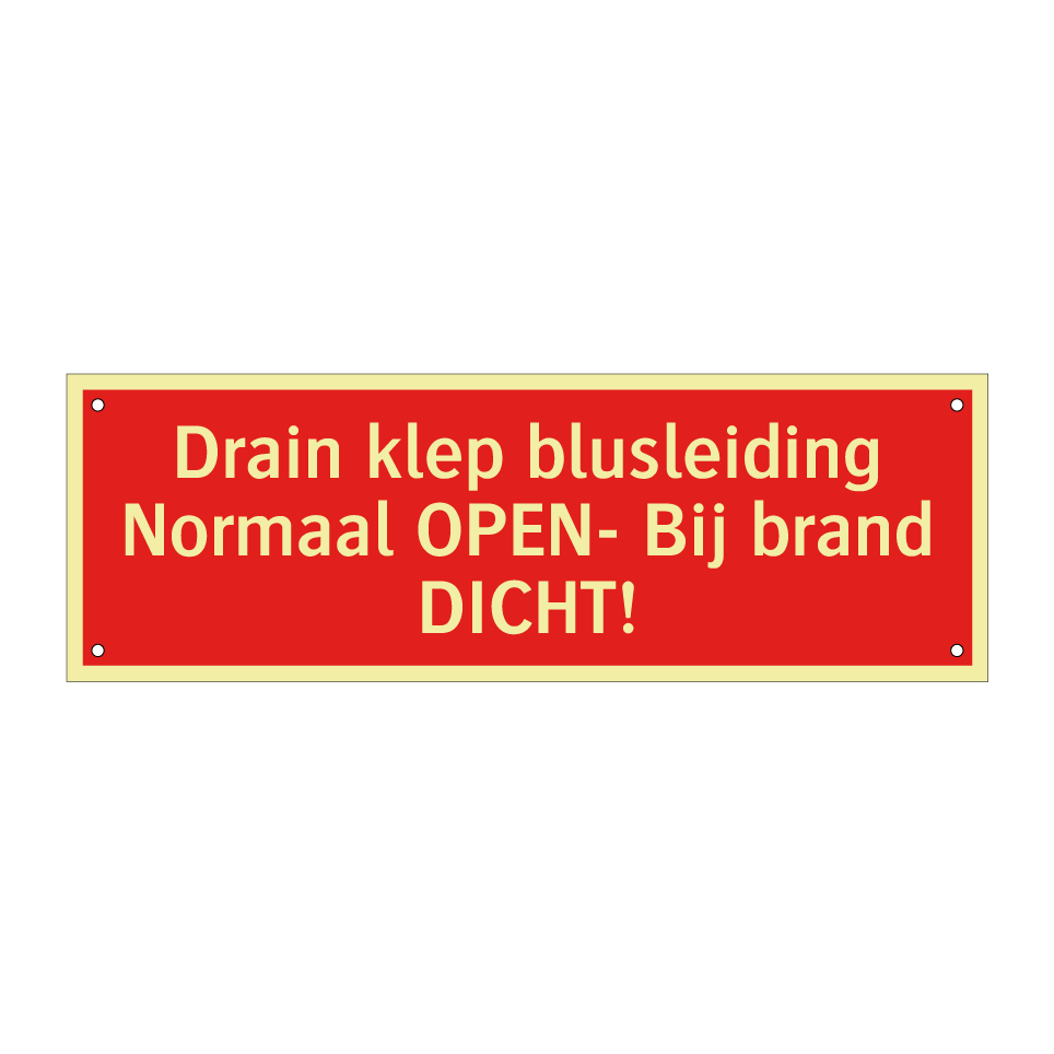 Brandbord met tekst Drain klep blusleiding Normaal OPEN- Bij brand DICHT!