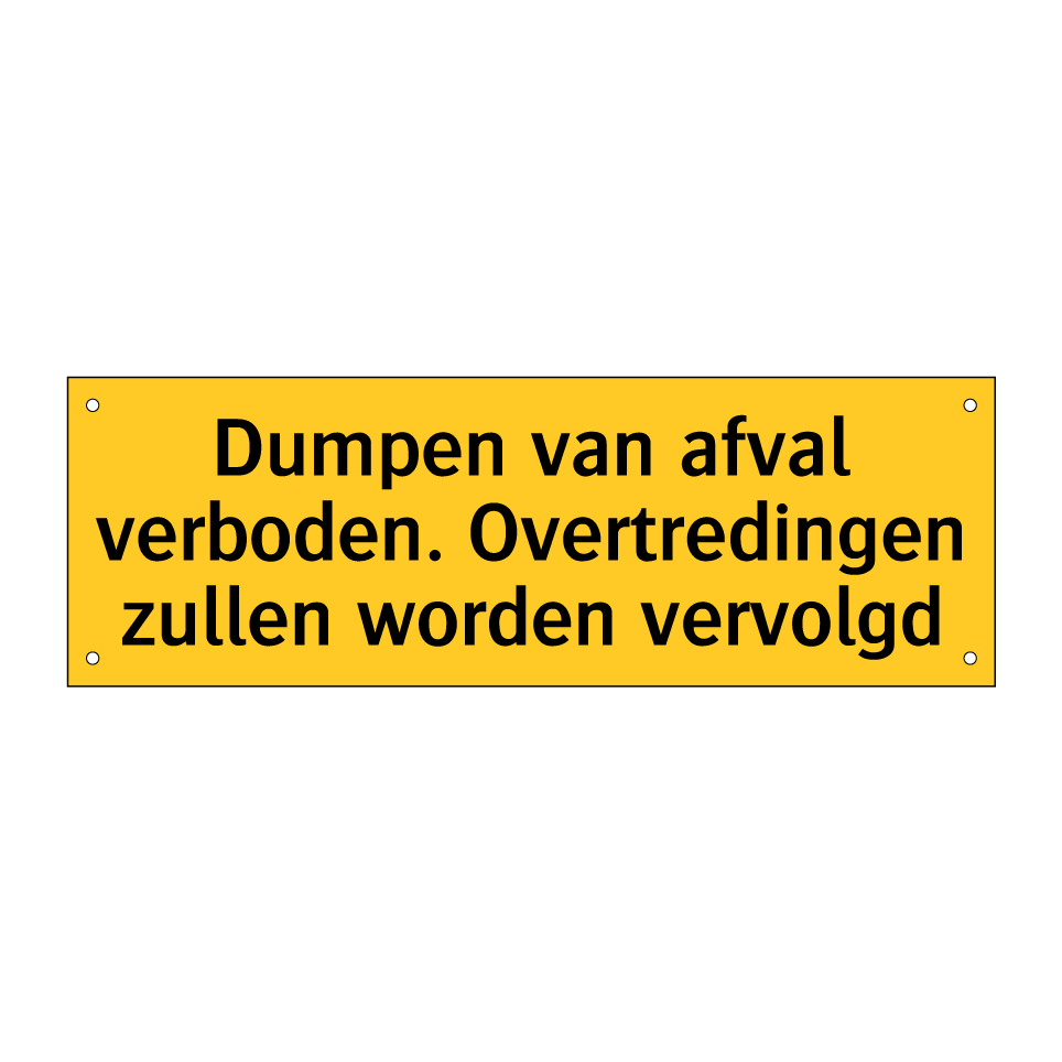 Waarschuwingsbord met de tekst Dumpen van afval verboden. Overtredingen zullen worden vervolgd