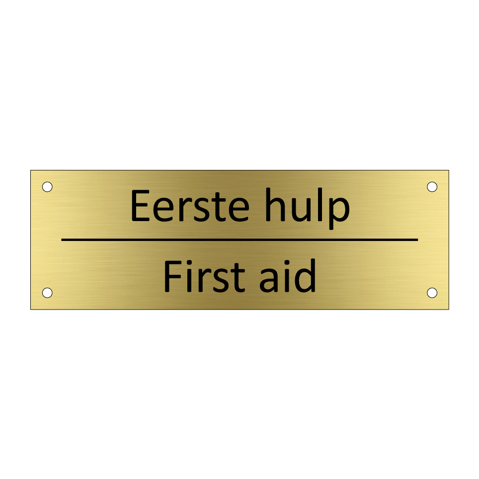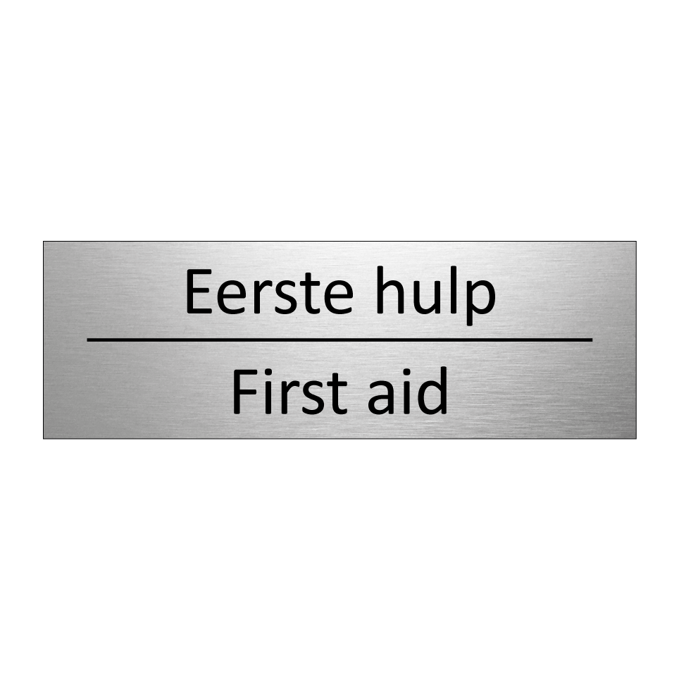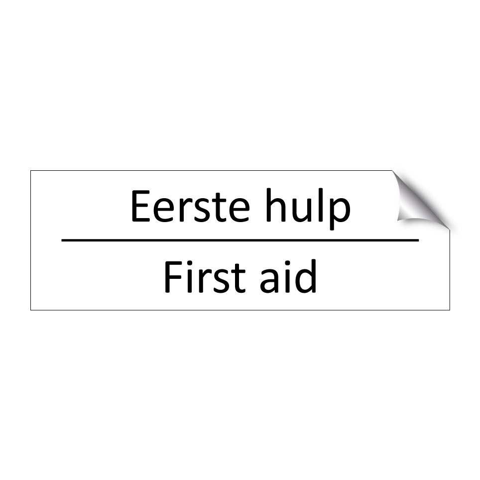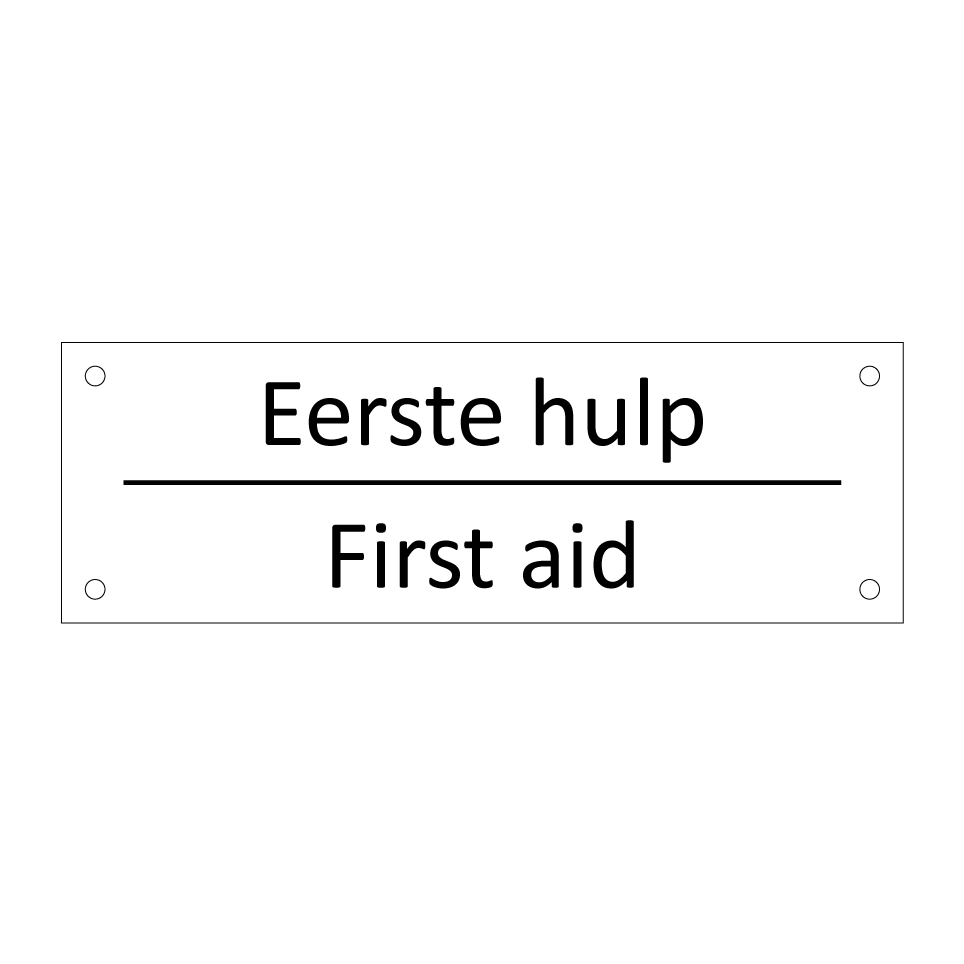Informatiebord met tekst in het nederlands en engels. Dit bord luidt: Eerste hulp evenals met de engelse vertaling First aid.